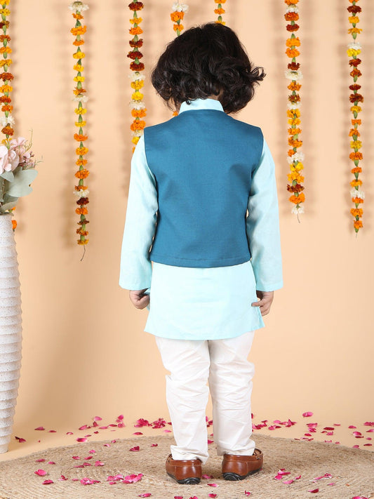 Polka Tots Full Sleeve Ethnic Kurta Pyjama Set with Foil Striped Koti - Aqua