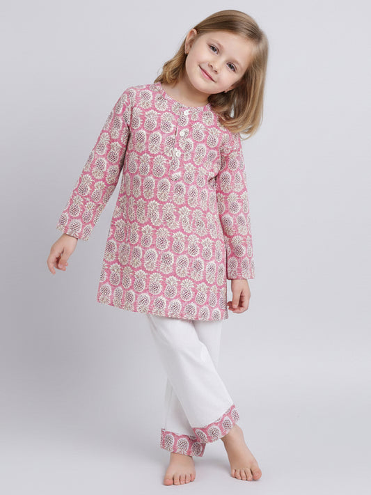 Polka Tots Pineapple print Full sleeves Nightwear Kurta pyjama set - Pink