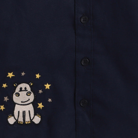 Polka Tots Full Sleeve Shirt Hippopotamus Thread Embroidery - Blue