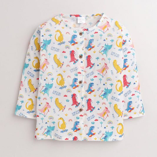 Polka Tots Dinosaur print Full Sleeves Nightwear Kurta pyjama set - White