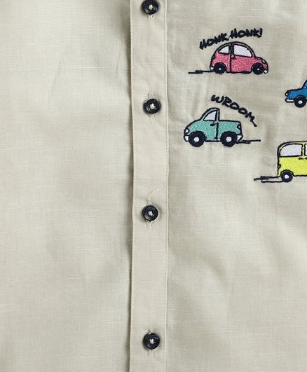 Polka Tots Full Sleeves Car Embroidered Shirt - Beige