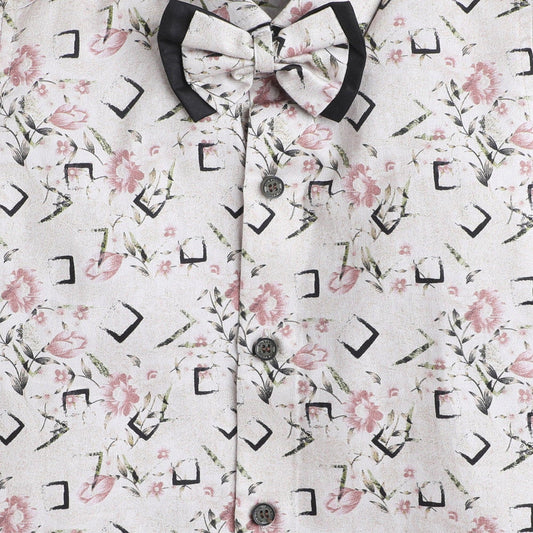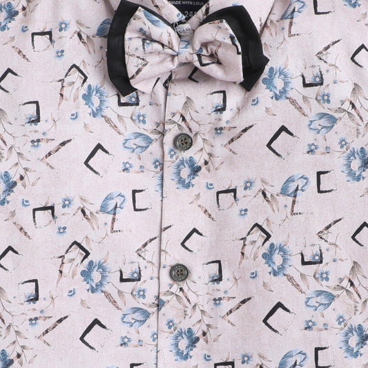 Polka Tots Cotton Full Sleeves Party Wear Shirt With Dual Bow Tie All Over Print - Beige
