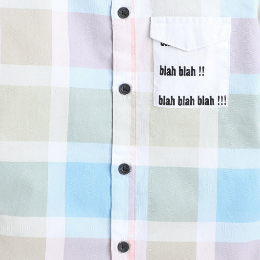 Polka Tots Cotton Full Sleeves Big Check Kids Shirt With Blah Blah Pocket Print - Cream and Green