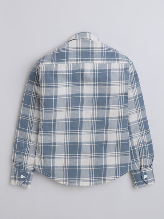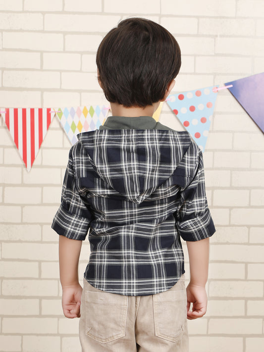 Polka Tots Full Sleeves Cotton Checked Shirt with Bear Patch - Blue