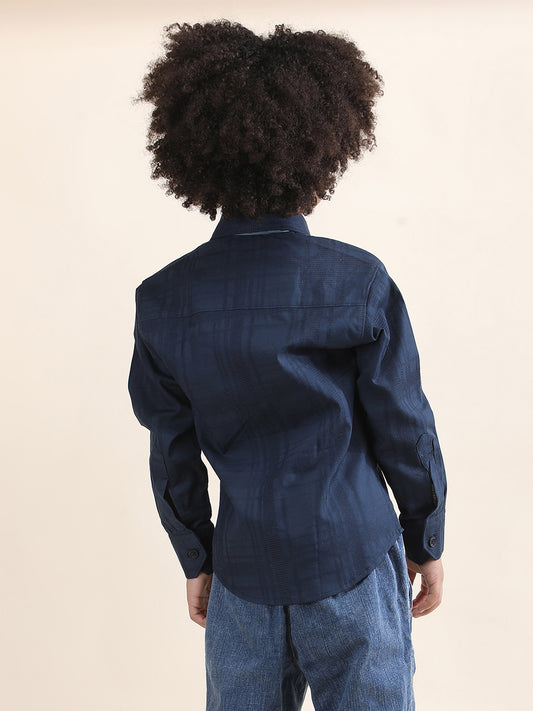 Polka Tots Full Sleeves Cotton self textured Shirt with Tie - Navy