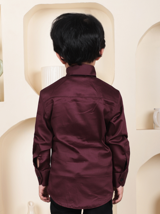 Polka Tots Full Sleeves Cotton Satin Shirt with Bow Tie - Maroon