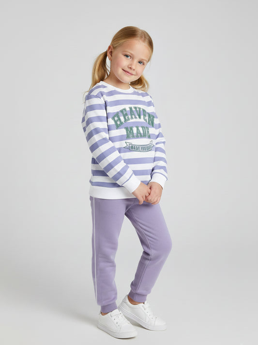 Polka Tots Full sleeve Striped Graphic Sweatshirt & Co-ord Jogger Set - Lilac & White