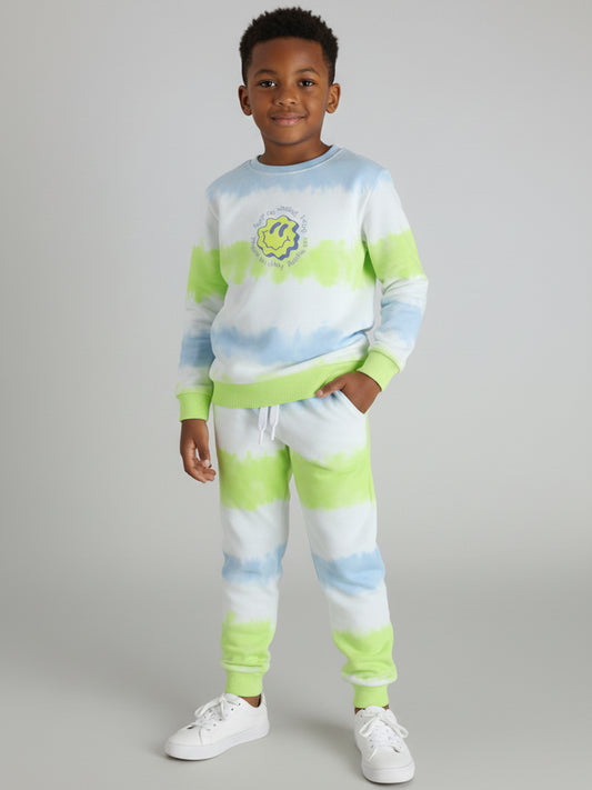 Polka Tots Full sleeve Tie-Dye Smiley Sweatshirt & Co-ord Jogger Set - Green & Blue