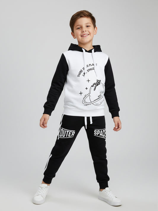 Polka Tots Full sleeve Space Graphic Hooded Sweatshirt & Co-ord Jogger Set - Black & White
