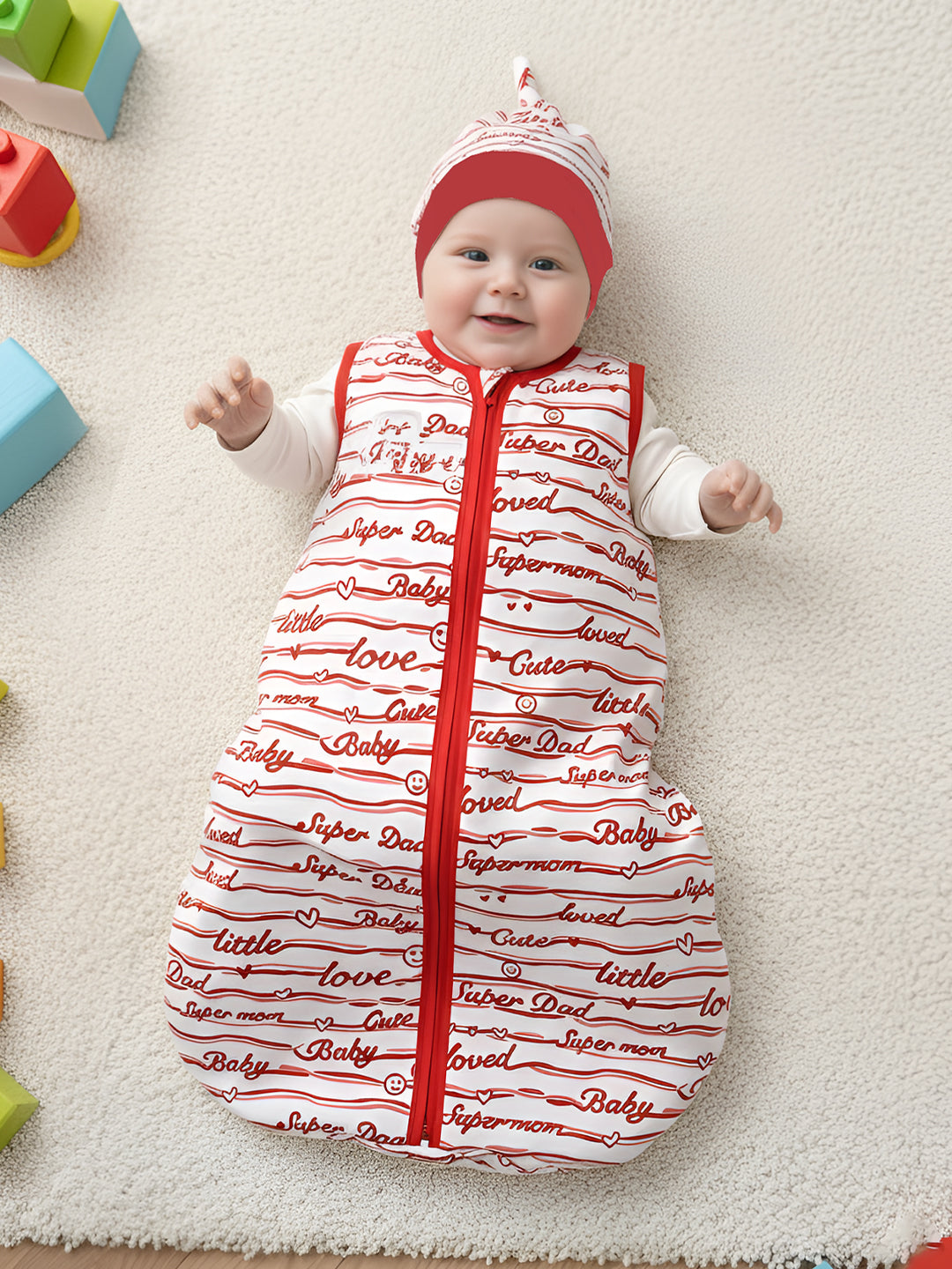 Polka Tots 100% Soft Cotton Baby Love Print Sleeping Bag with Cap - Red