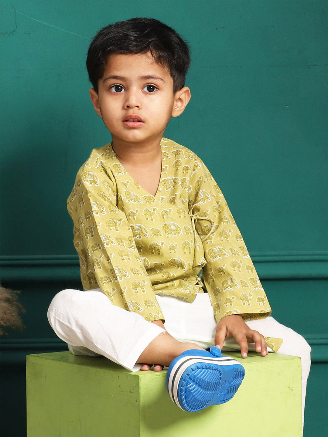 Polka Tots 100% Super Soft Cotton Full Sleeve Elephant Print Front Open Angrakha Kedia Pant Set - Green