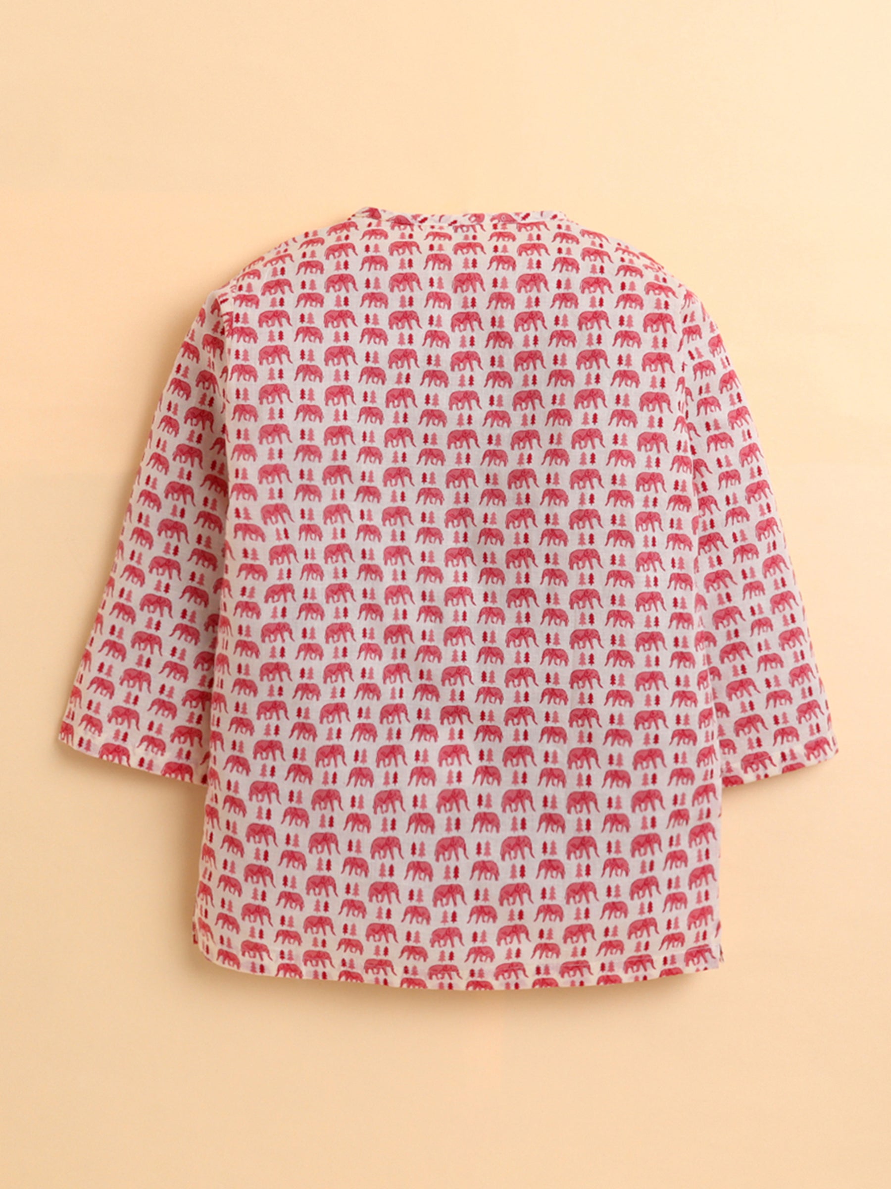 Polka Tots Cotton Full Sleeve Elephant Tree Print Angrakha Top With Dhoti - Pink