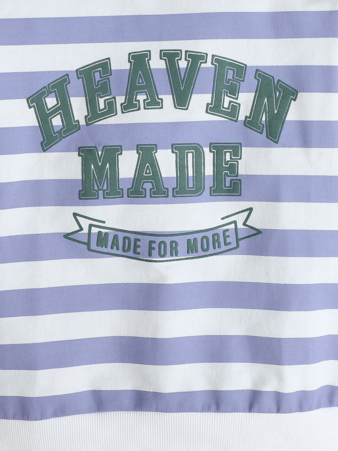 Keep your little one cozy and charming with the Polka Tots Full Sleeve Striped Sweatshirt & Jogger Co-ord Set in a soft lilac and crisp white color palette. Crafted from a comfortable, soft fabric, this set ensures warmth and ease for any activity. The crew-neck sweatshirt features horizontal lilac and white stripes, ribbed cuffs, and a collegiate-style graphic print that reads "HEAVEN MADE" above a banner that says "MADE FOR MORE" in green and white. The matching solid lilac joggers come with a comfortable white drawstring waist, ribbed ankle cuffs, and thin white piping detail along the side seams, adding a sporty touch. Designed for durability and casual style, this co-ord set offers the perfect balance of comfort and a relaxed, fashionable look.