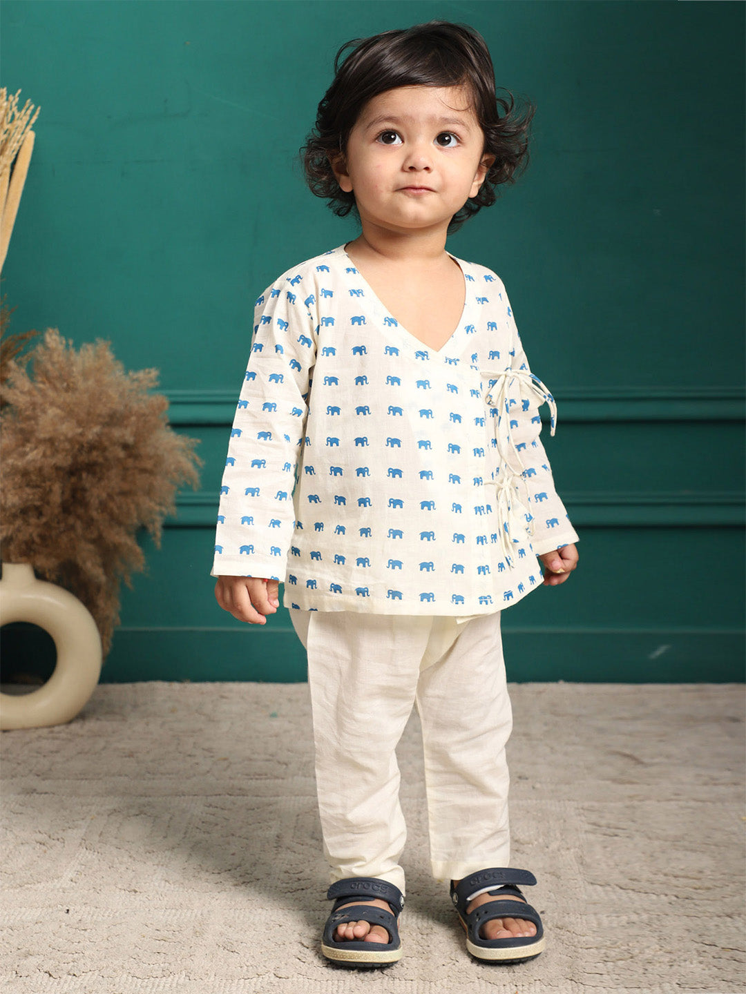 Polka Tots Full Sleeve Elephant Print Front Open Angrakha Kedia Pant Set - Blue