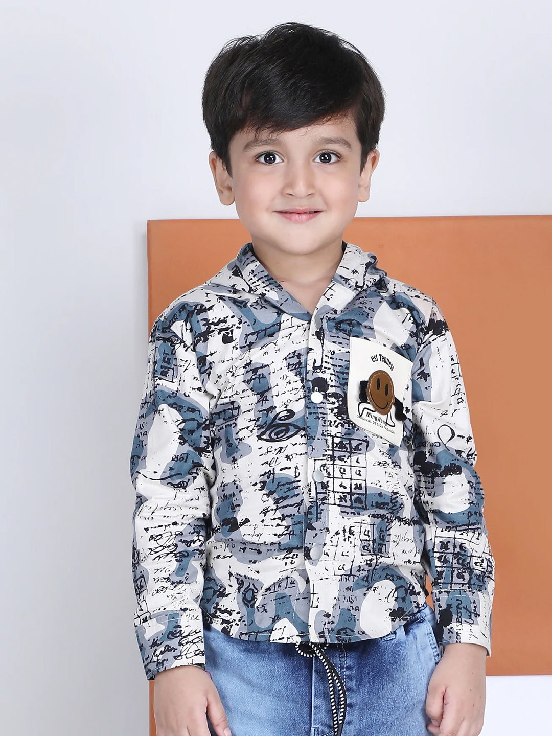 Polka Tots Full Sleeves Abstract Scribble Print Hooded Kids Shirt with Smiley Patch - Blue