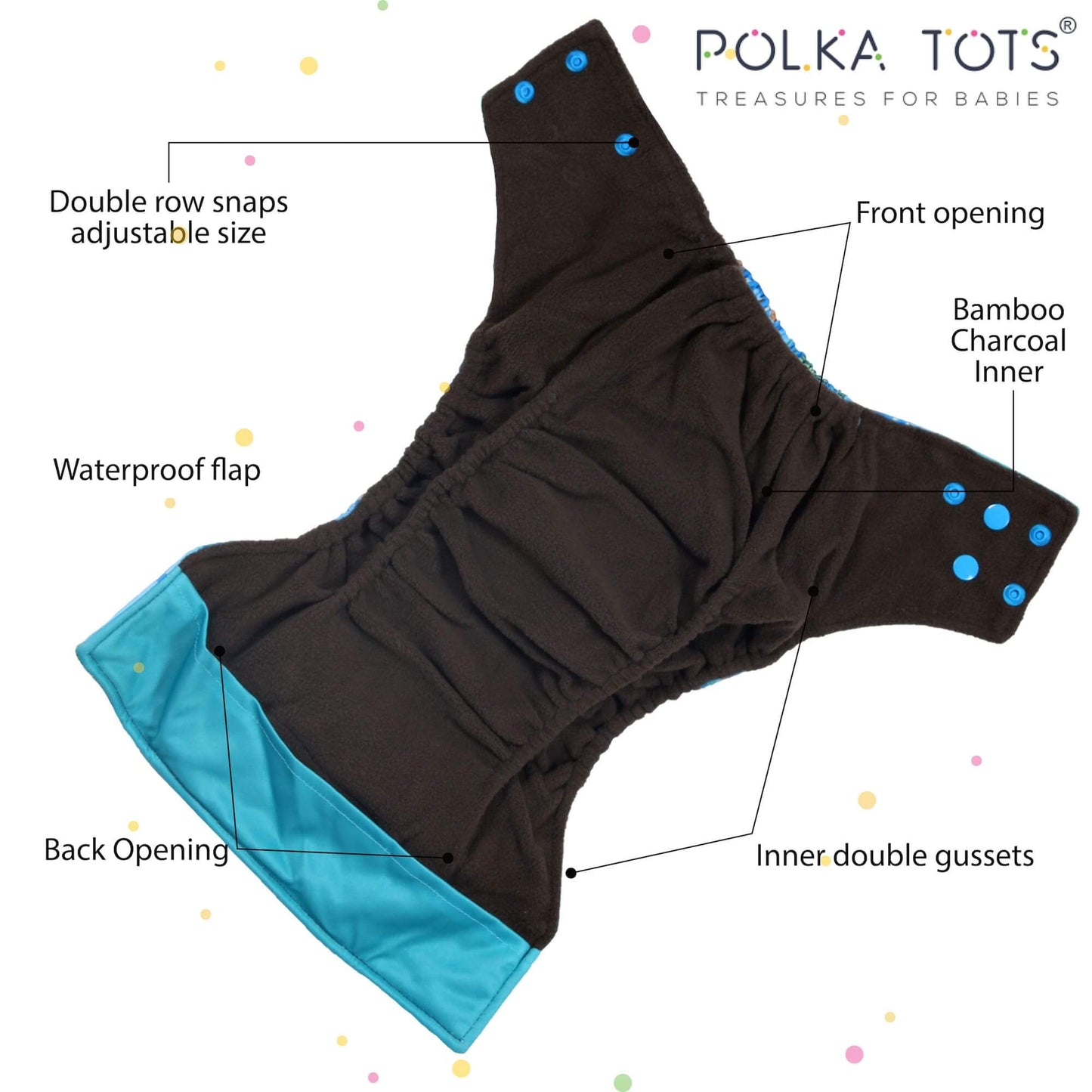 Polka Tots Charcoal Diaper has a Comfortable elastic legging area. It is meticulously crafted with ultra-soft, hypoallergenic materials, gentle on delicate skin, and suitable for even the most sensitive babies.