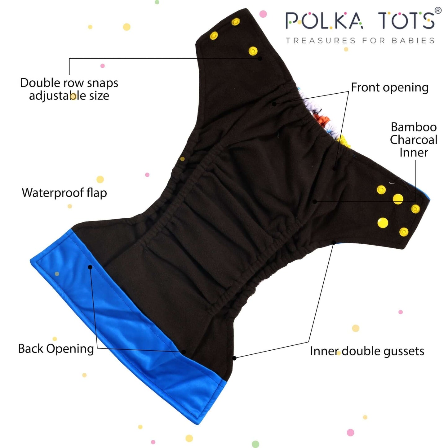 Polka Tots Charcoal Diaper has a Comfortable elastic legging area. It is meticulously crafted with ultra-soft, hypoallergenic materials, gentle on delicate skin, and suitable for even the most sensitive babies.