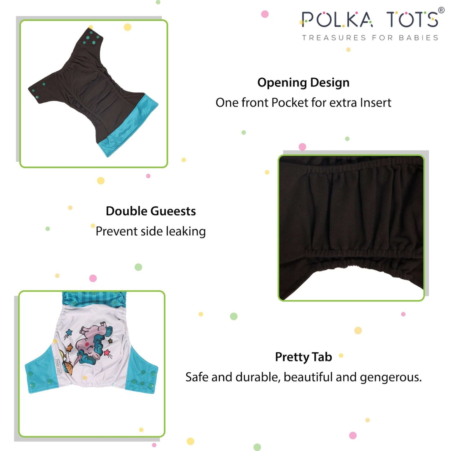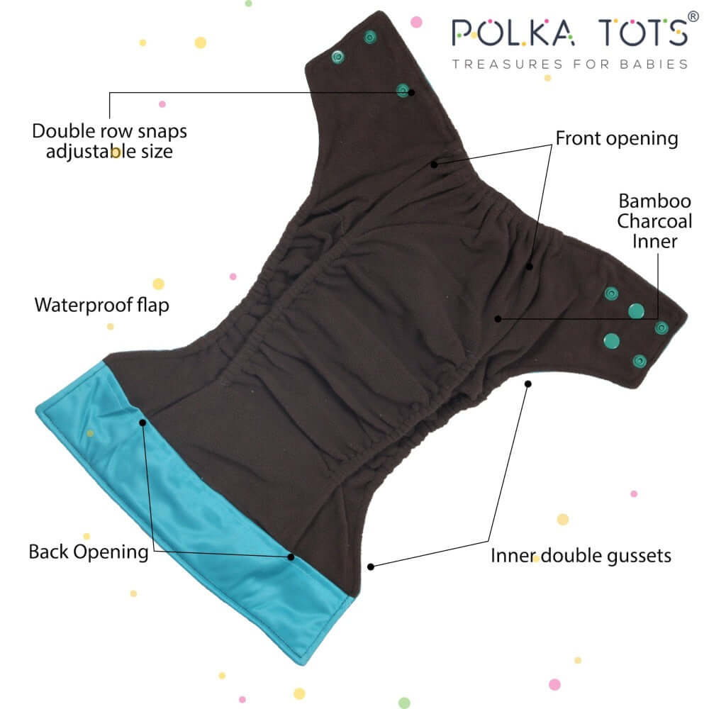 Polka Tots Charcoal Diaper has a Comfortable elastic legging area. It is meticulously crafted with ultra-soft, hypoallergenic materials, gentle on delicate skin, and suitable for even the most sensitive babies.