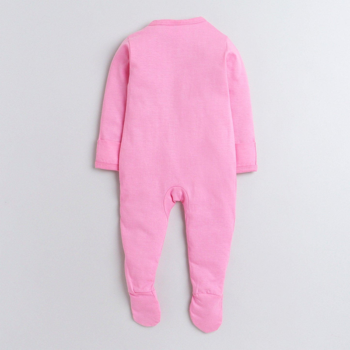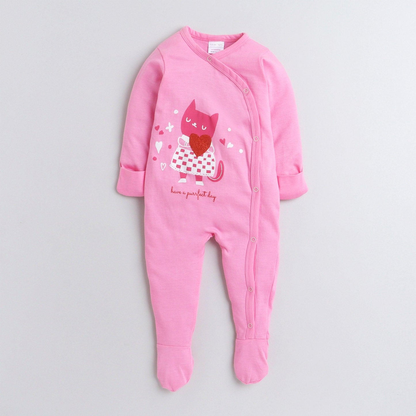 Polka Tots Full Sleeves Folded Mittens Style Cat Print Footed Romper - Pink