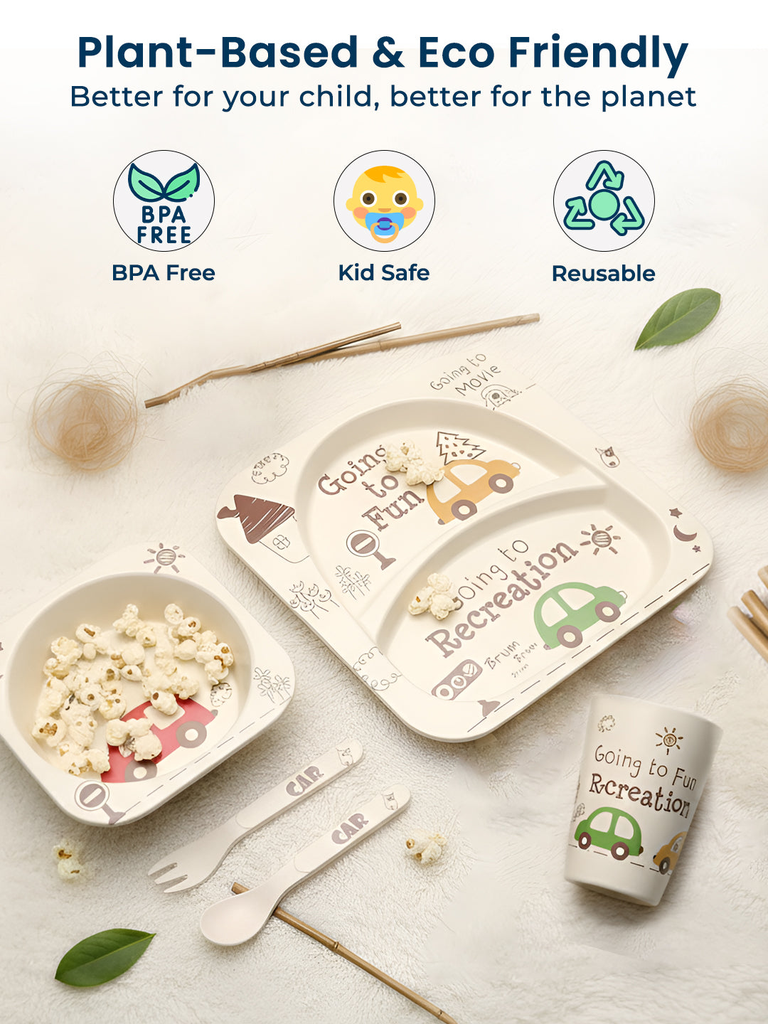 Safe Material: Made from natural bamboo fiber, these dinner sets are free from harmful chemicals like BPA, phthalates, and PVC, ensuring your childs safety during mealtimes.