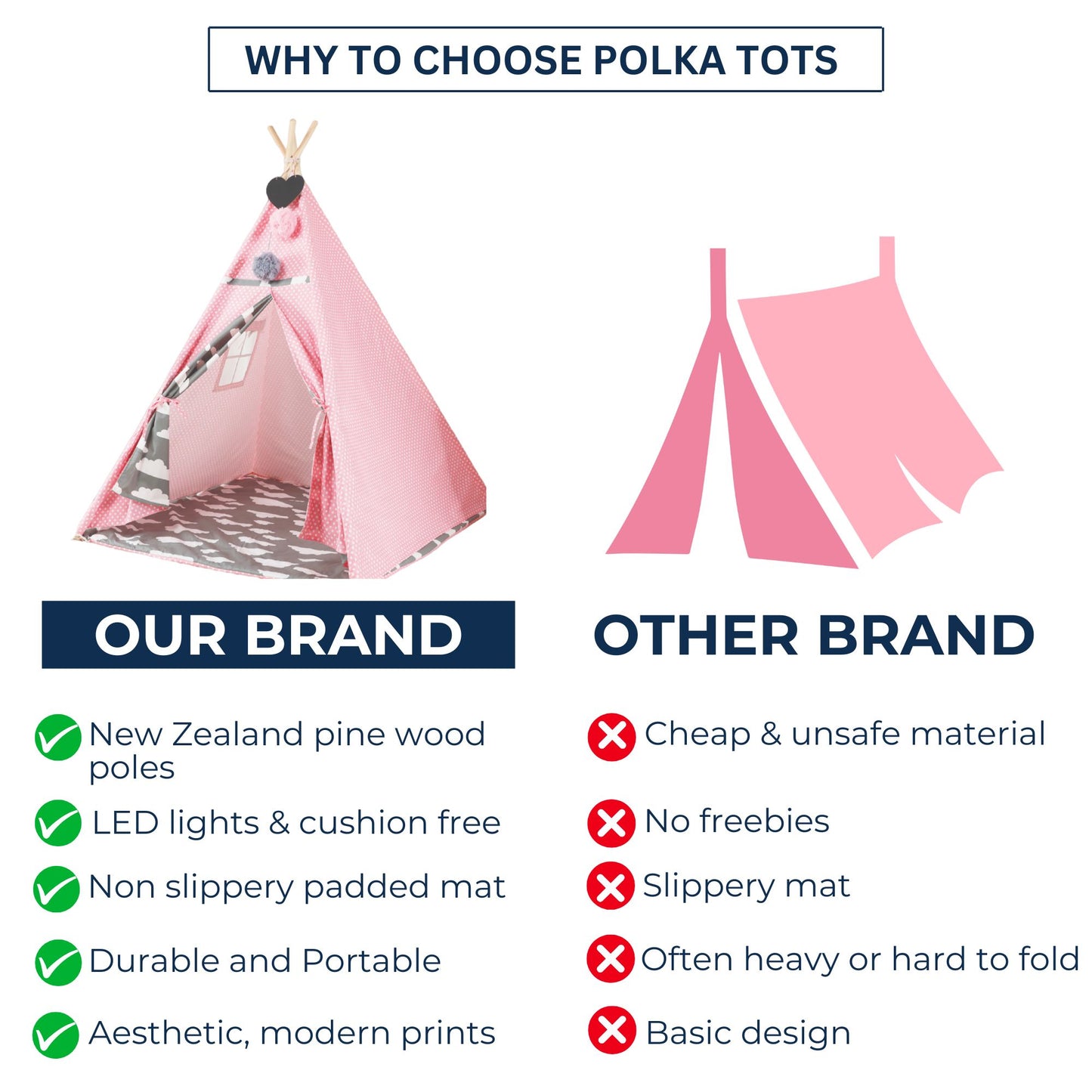 Here at Polka Tots, we share your love for outdoor and indoor play teepees. Our own kids adore them too! We guarantee that your child will happily spend hours in their very own tent house, and we assure you its completely risk-free. We are deeply passionate about providing safe teepee tents to children everywhere, allowing them to explore their imagination in their own special spaces.