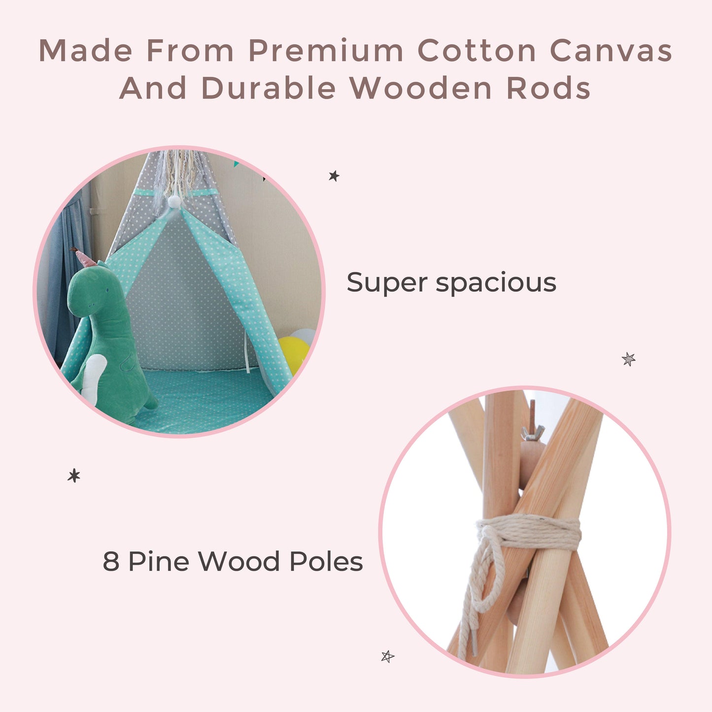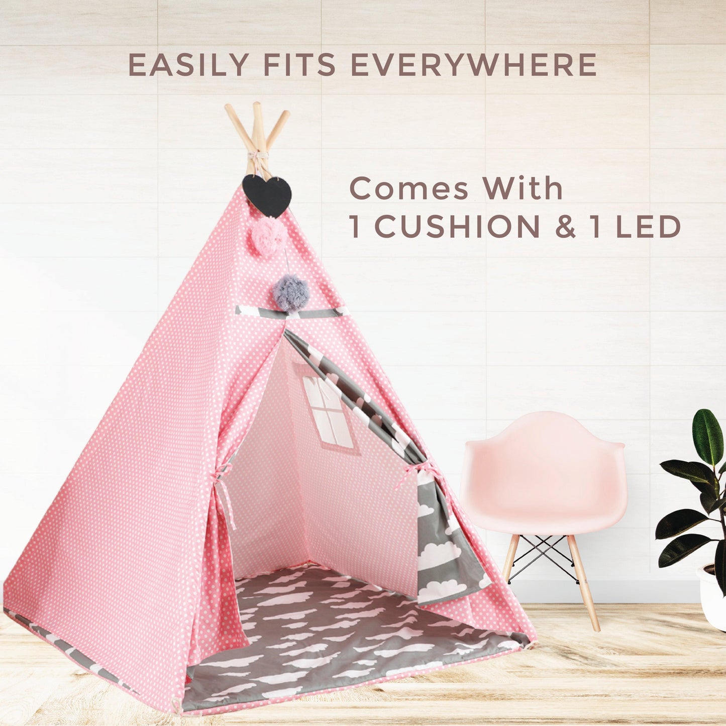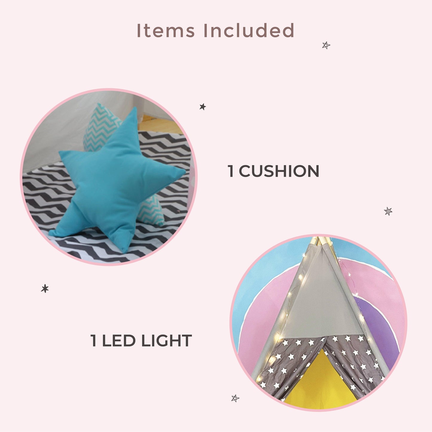 Items Included: 8 Pine Poles, 1 LED, 1 Cushion, 1 Non-slip Mat, 1 Teepee Tent Cover & Accessory Packet