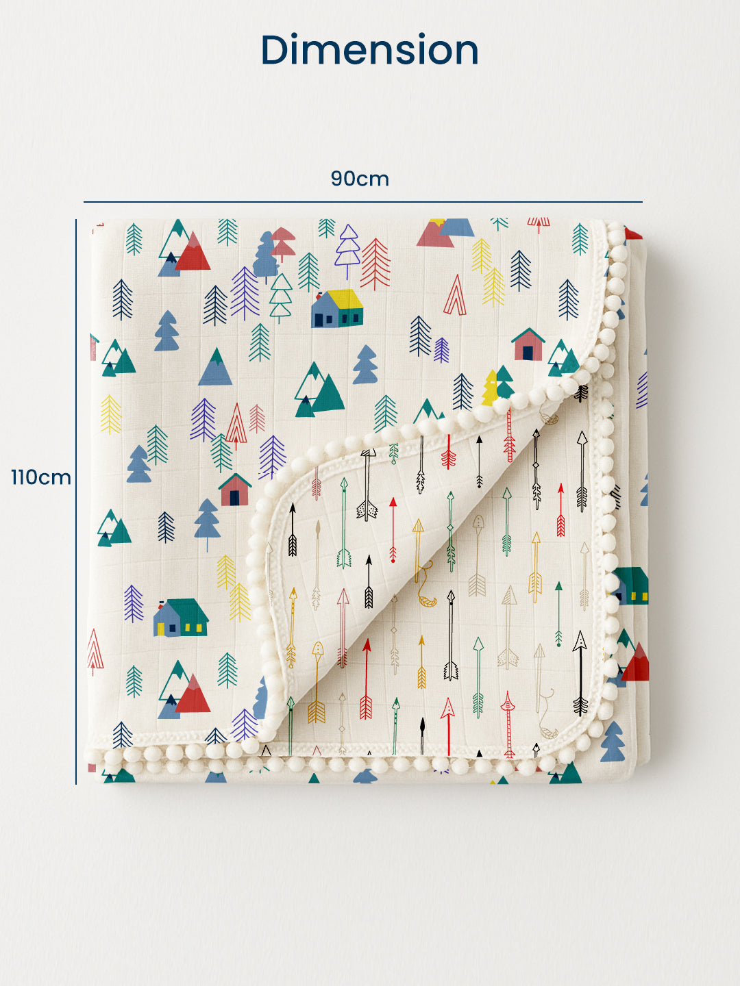 Polka Tots 100% Soft Muslin Cotton 3-Layer Reversible Baby Blanket/Dohar with Pom-Pom Lace - Tiny Town and Cupid Print