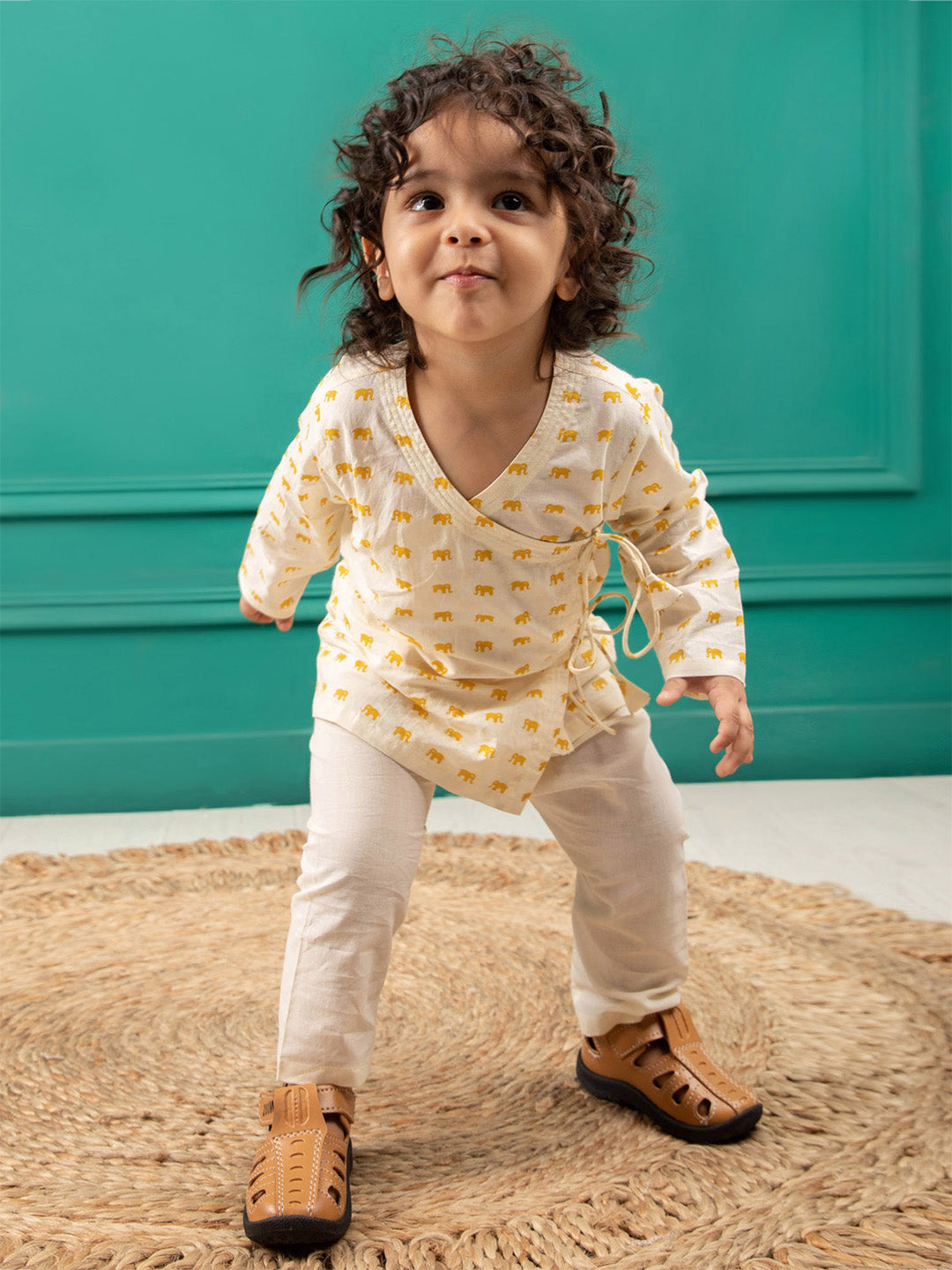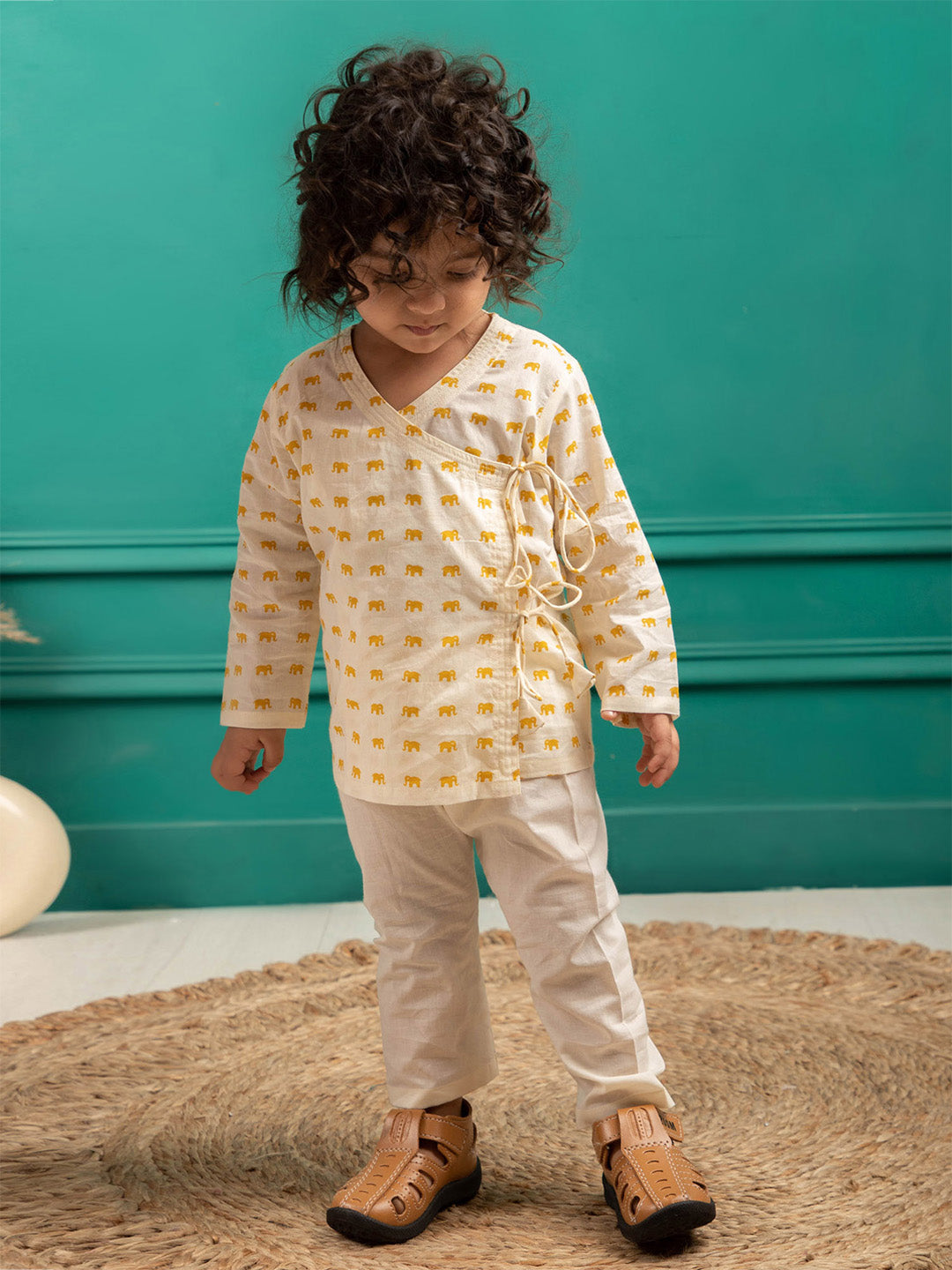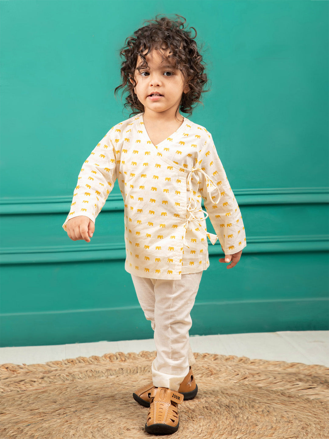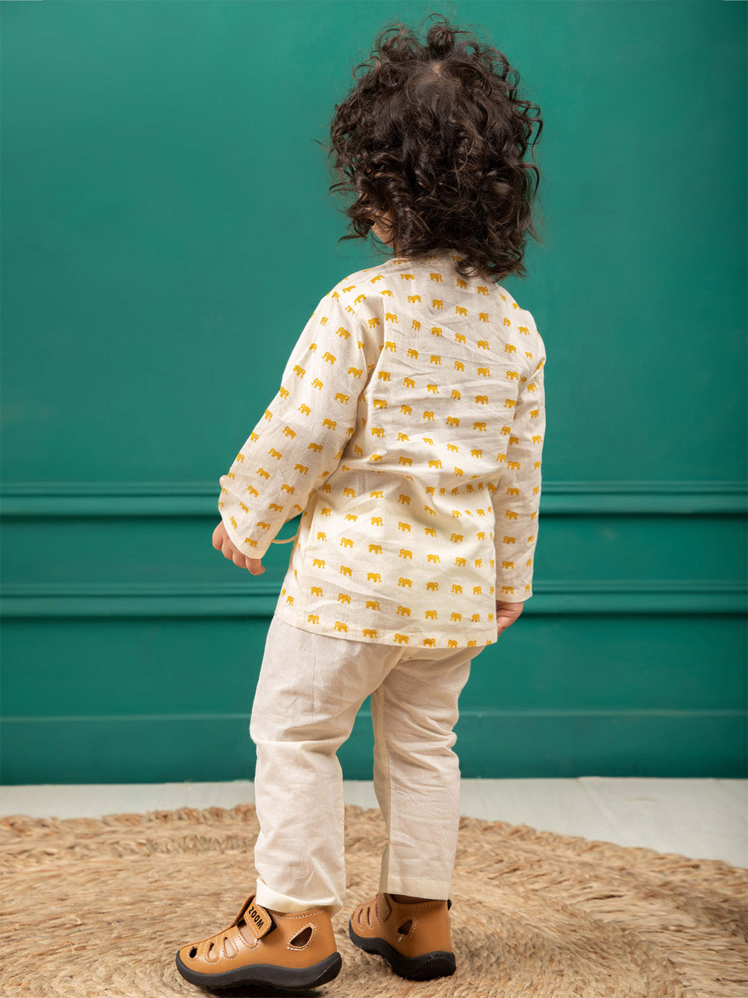 Polka Tots Full Sleeve Elephant Print Front Open Angrakha Kedia Pant Set - Cream