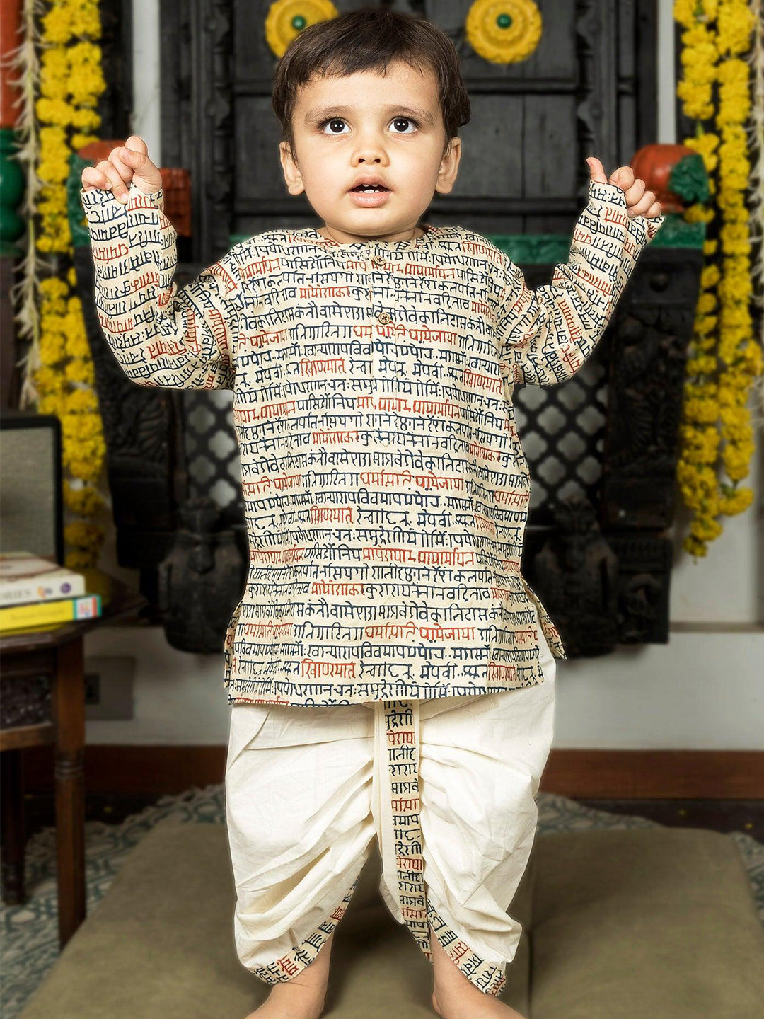 Polka Tots Full Sleeves Sanskrit Writing Print Kurta with Dhoti Set - Cream