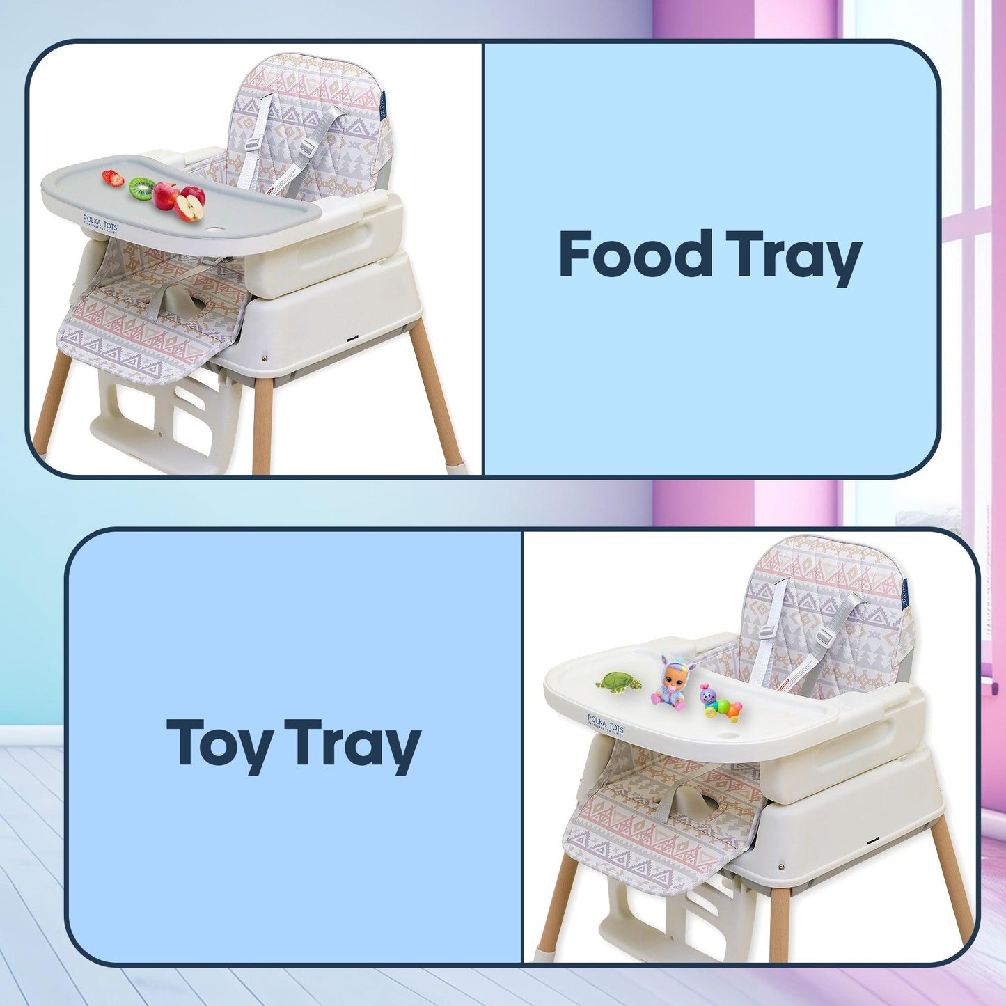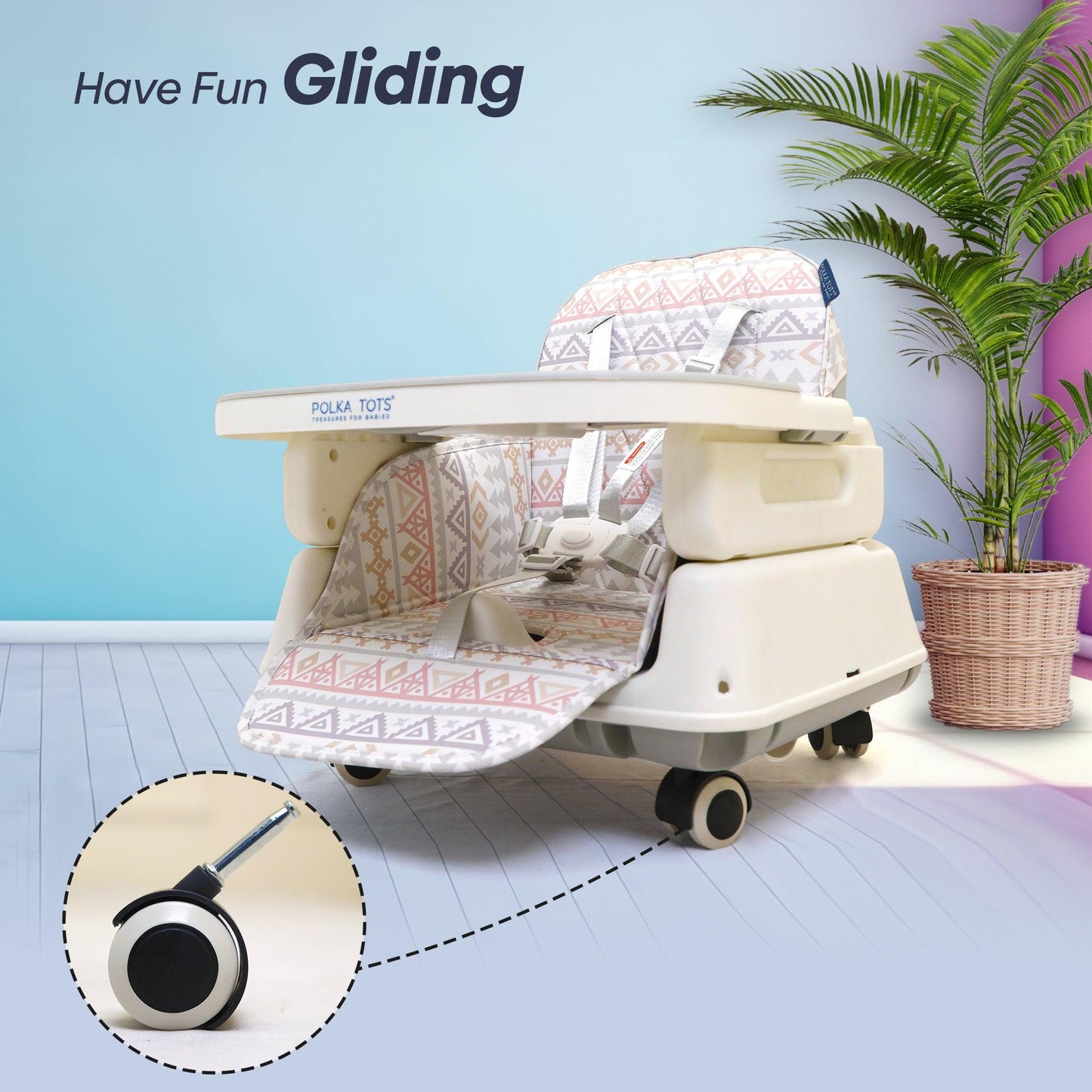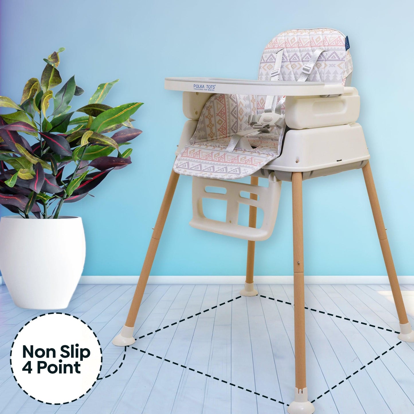 Look for a highchair with safety, adjustability, comfort, ease of cleaning, foldability, portability, affordability & Polka Tots Kids Feeding Chairs have it all.