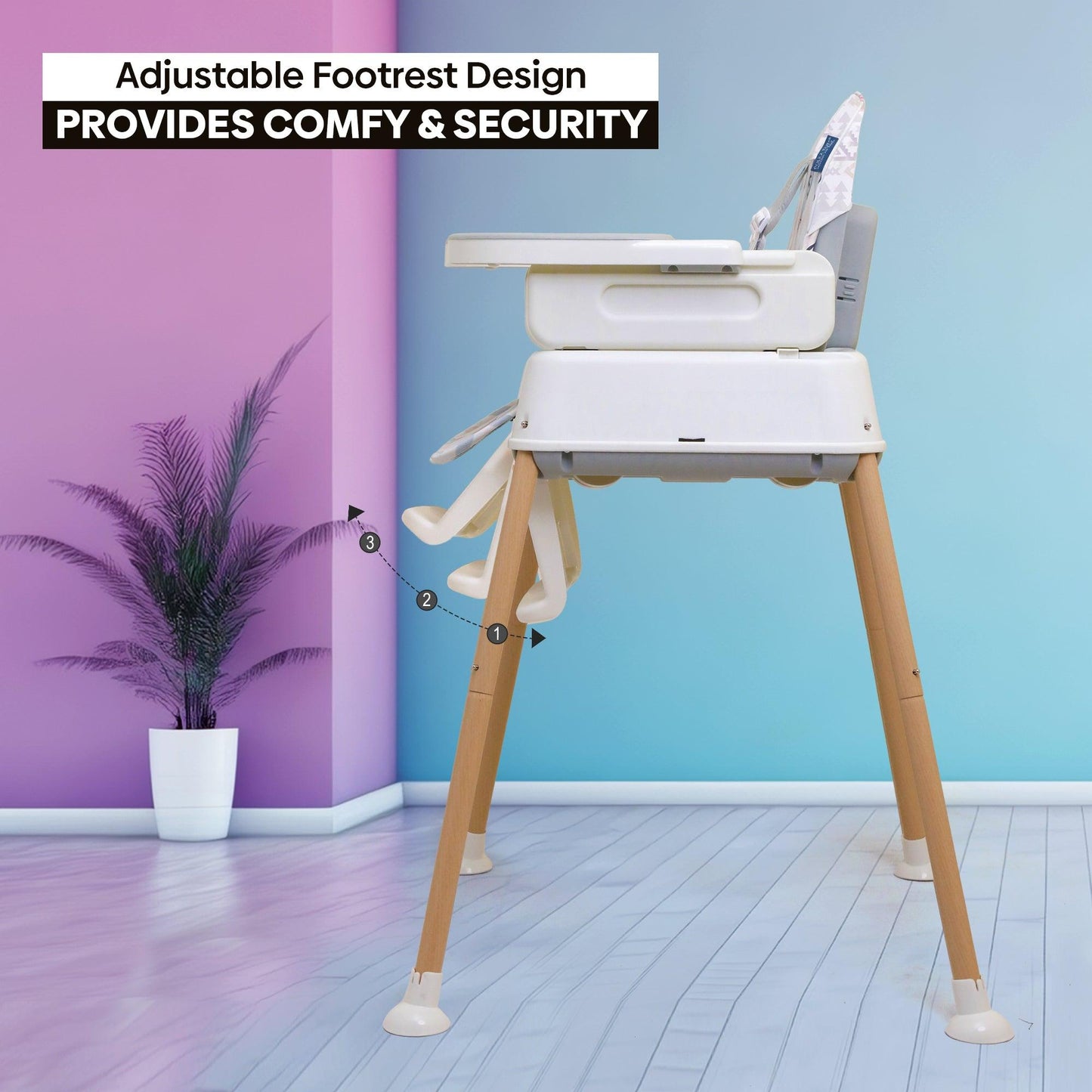 - Safety Harness - The 5-point safety harness ensures that your child is securely strapped into the highchair, minimizing the risk of slips or falls during mealtimes. With adjustable straps that fasten around the shoulders, waist, and between the legs, this harness provides a snug and secure fit, keeping your child safely in place throughout the meal.