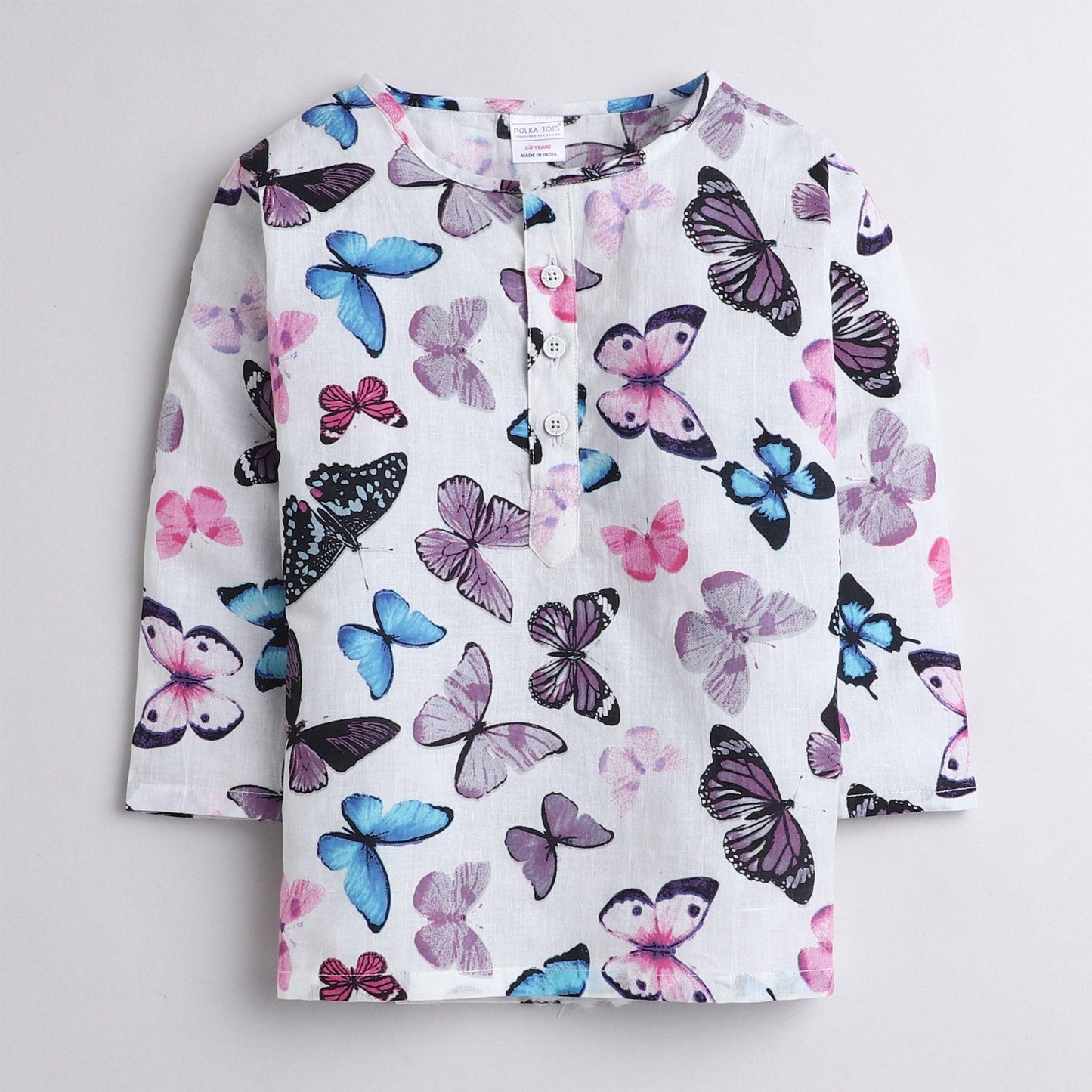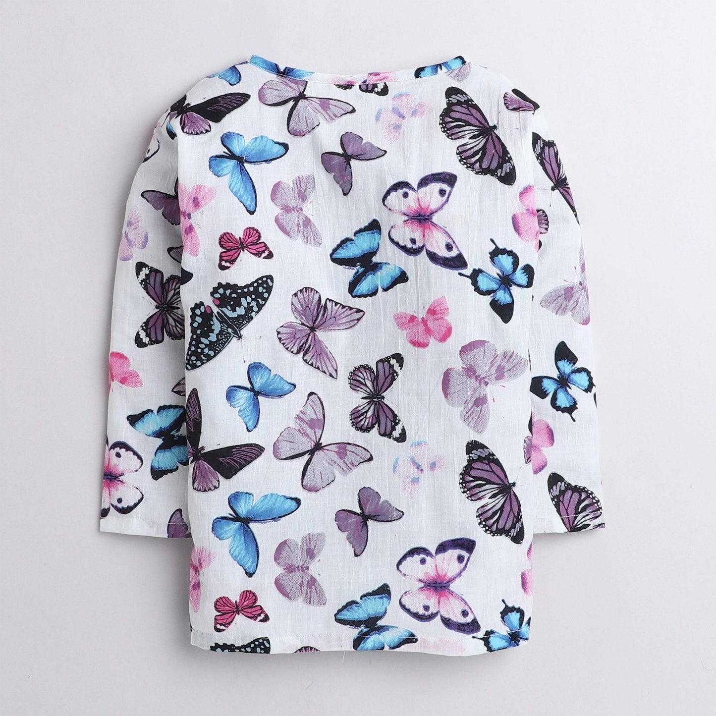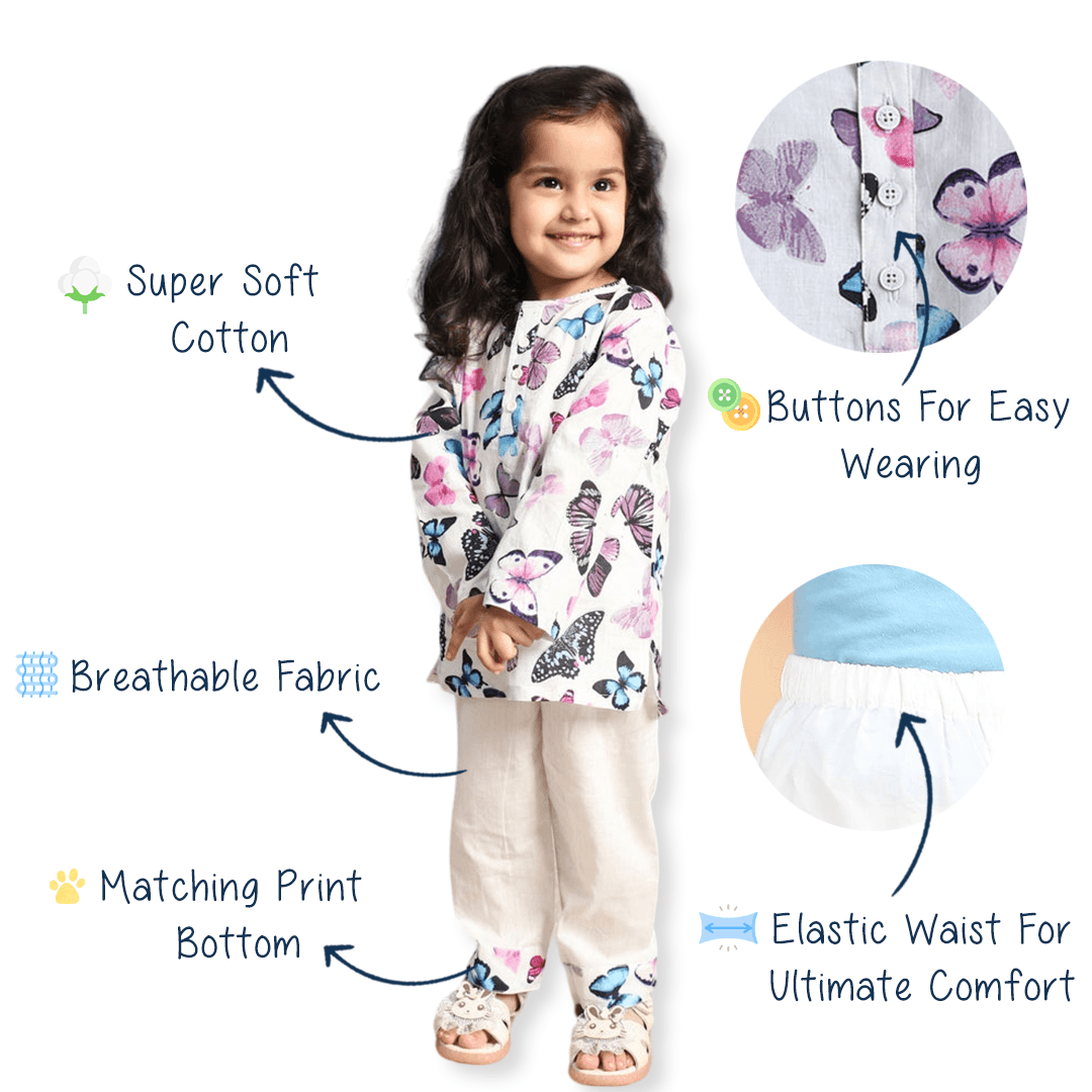 Polka Tots Butterfly print Full sleeves Nightwear Kurta pyjama set- White