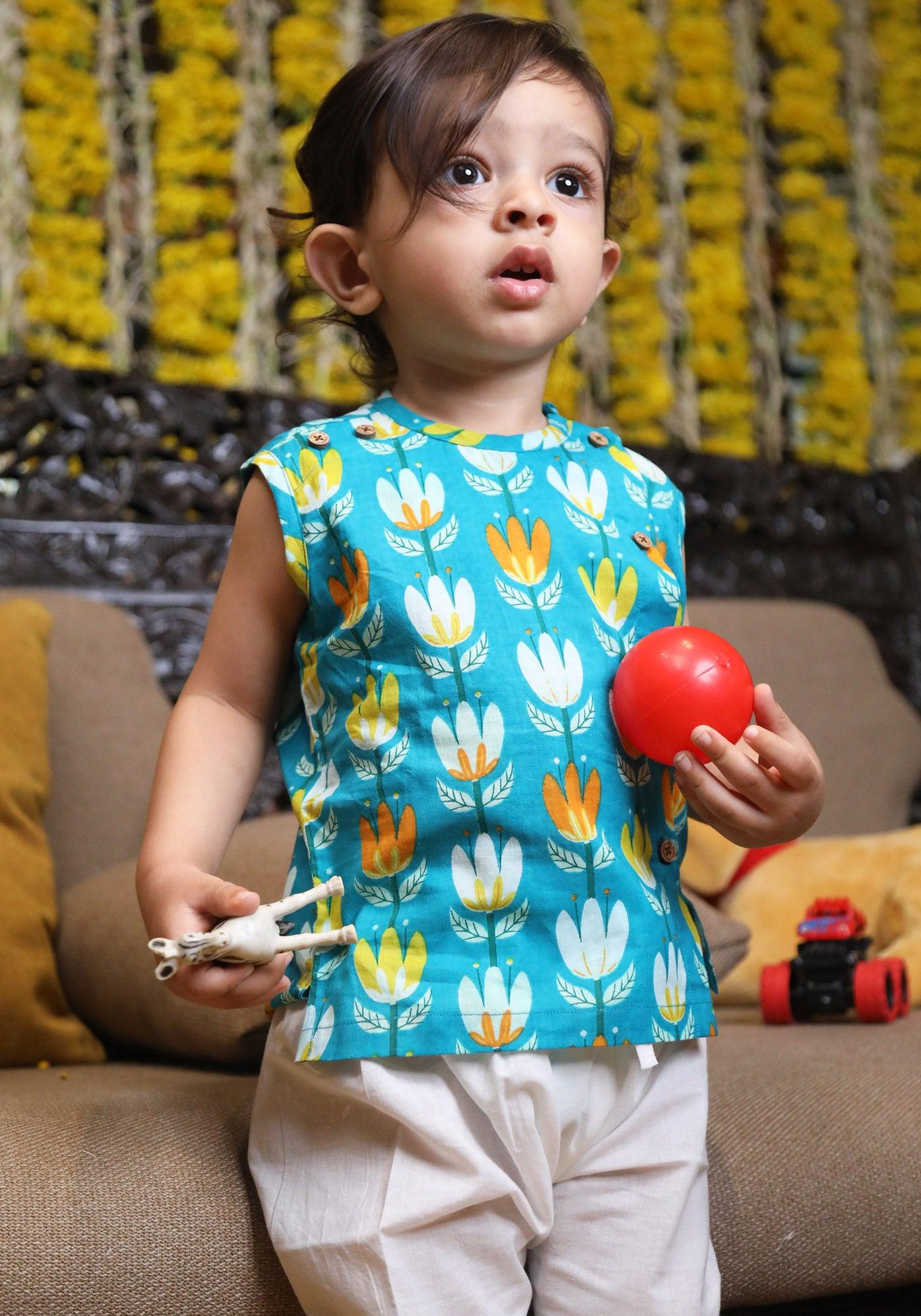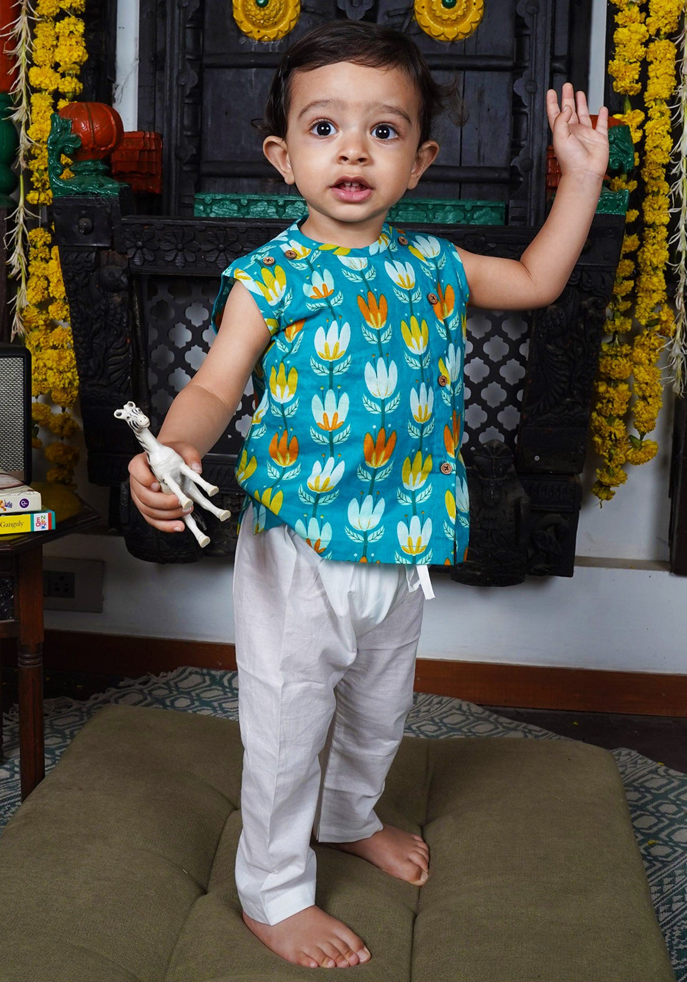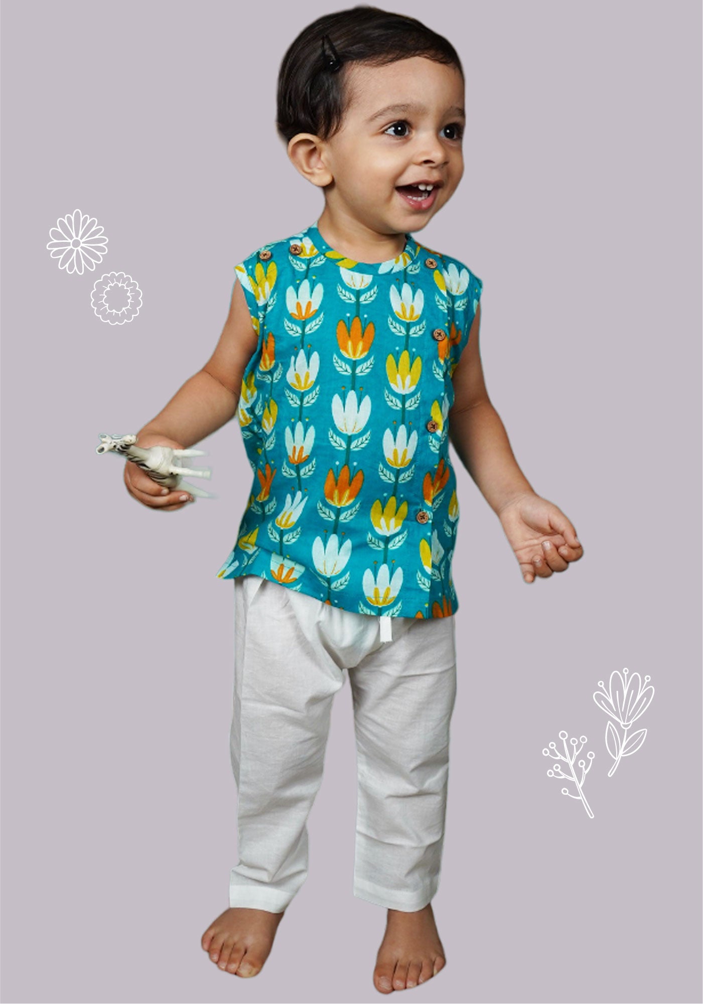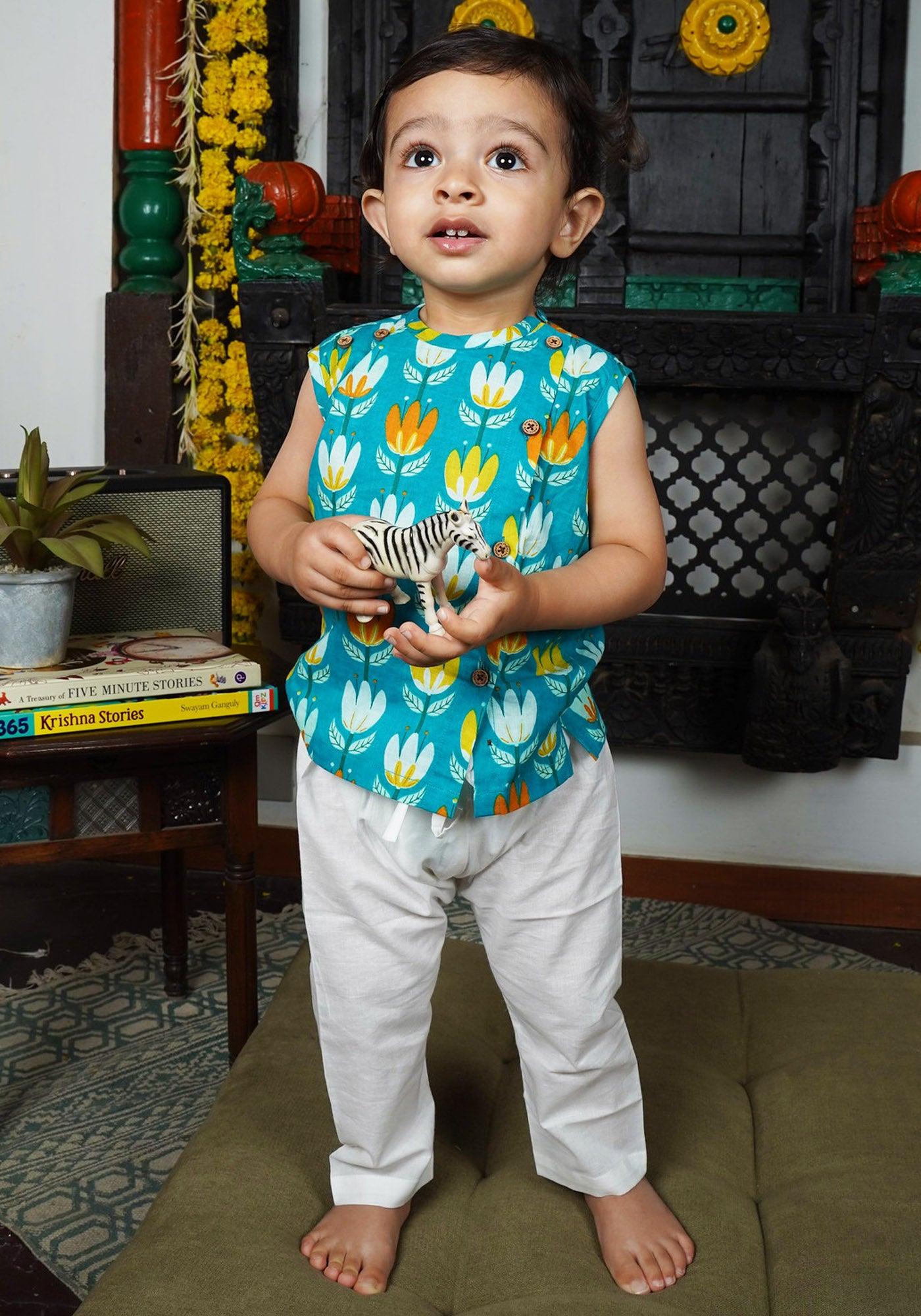 Polka Tots Lotus Print Sleeveless Jhabla and Pant Set - Blue & White