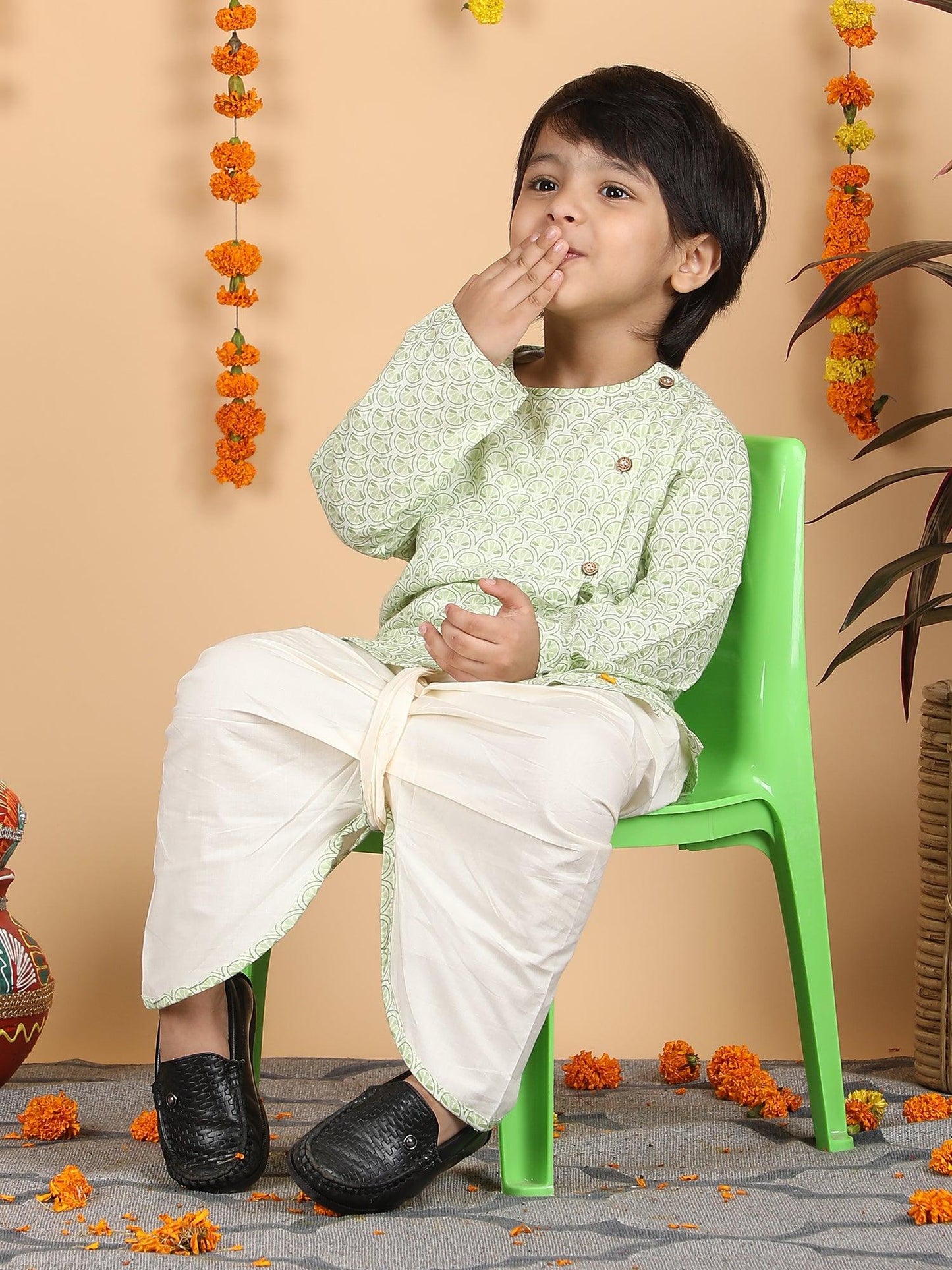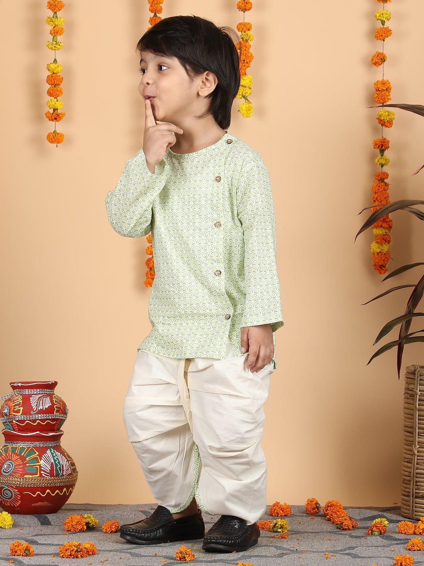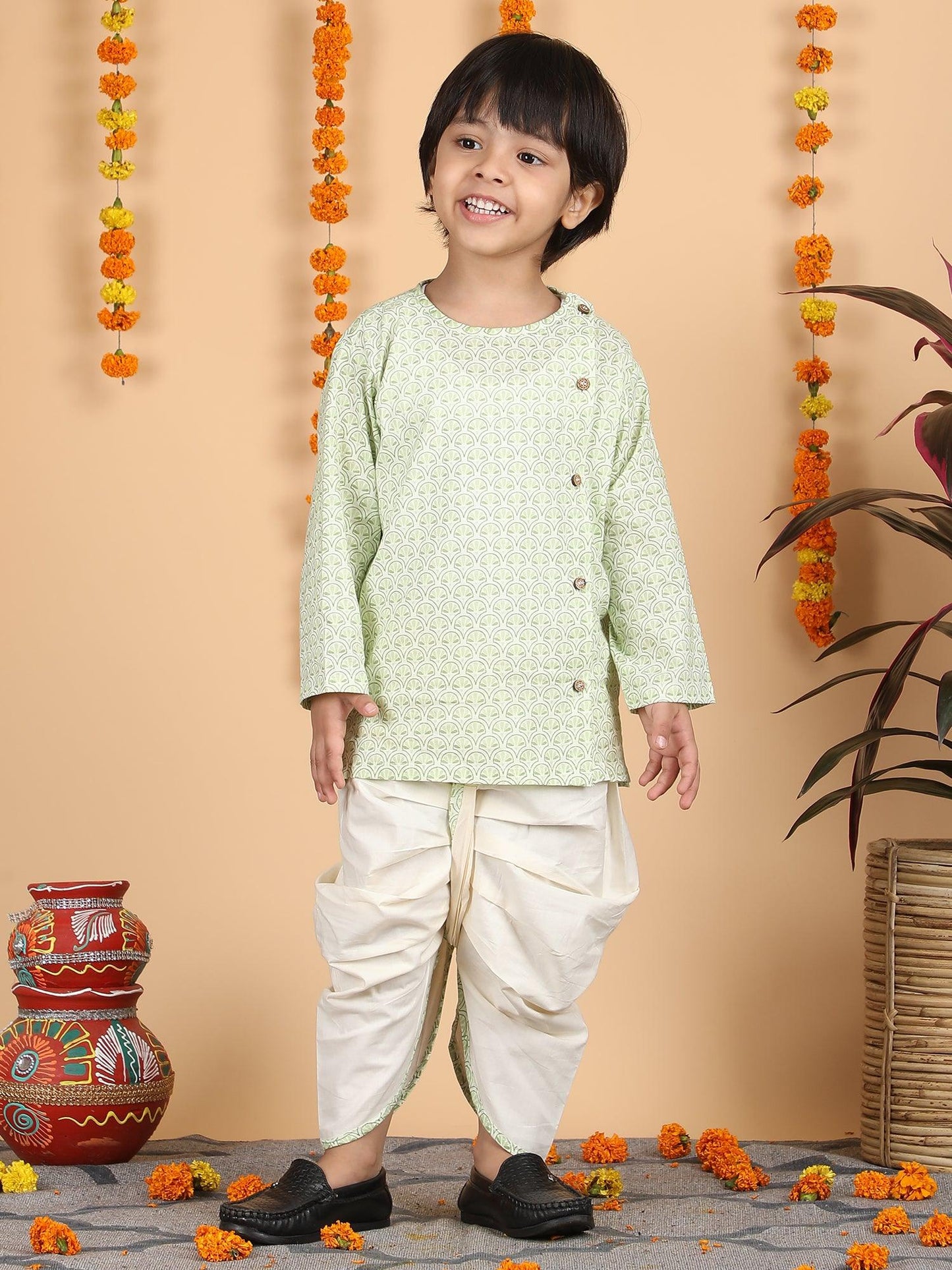 Polka Tots Full Sleeve Traditional print Angrakha Top With Dhoti - Green