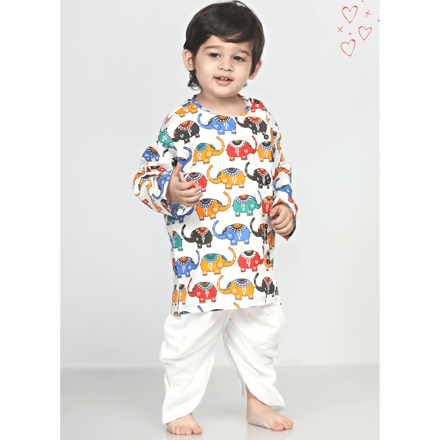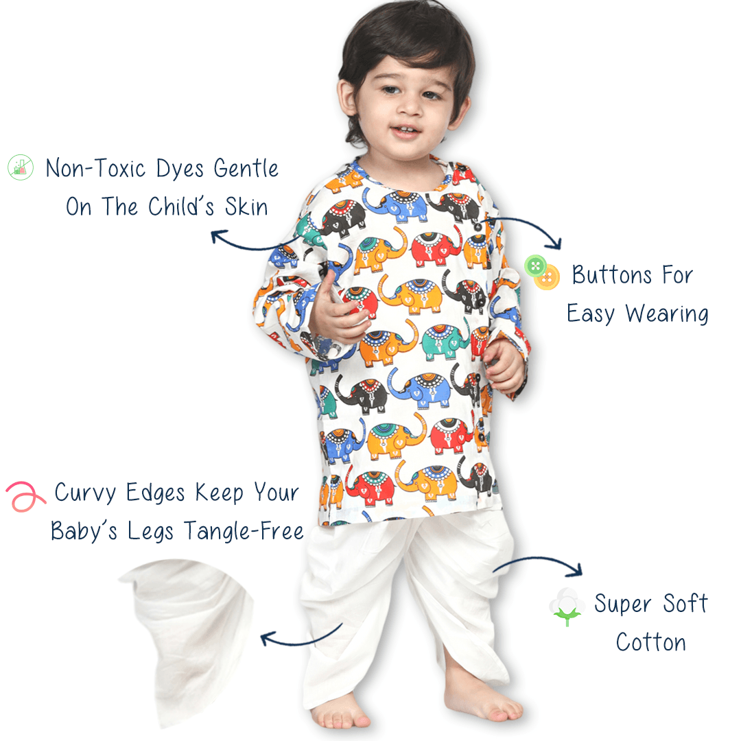Polka Tots Dhoti Kurta Set for Boys 100% Super Soft Cotton Traditional Ethnic Wear For Kids Elephant White