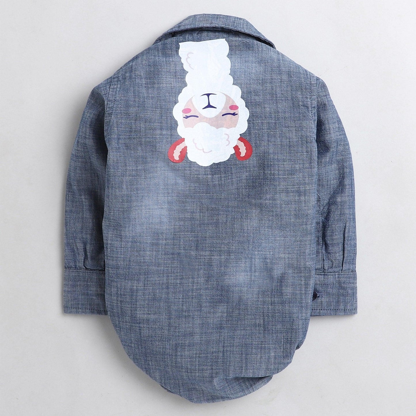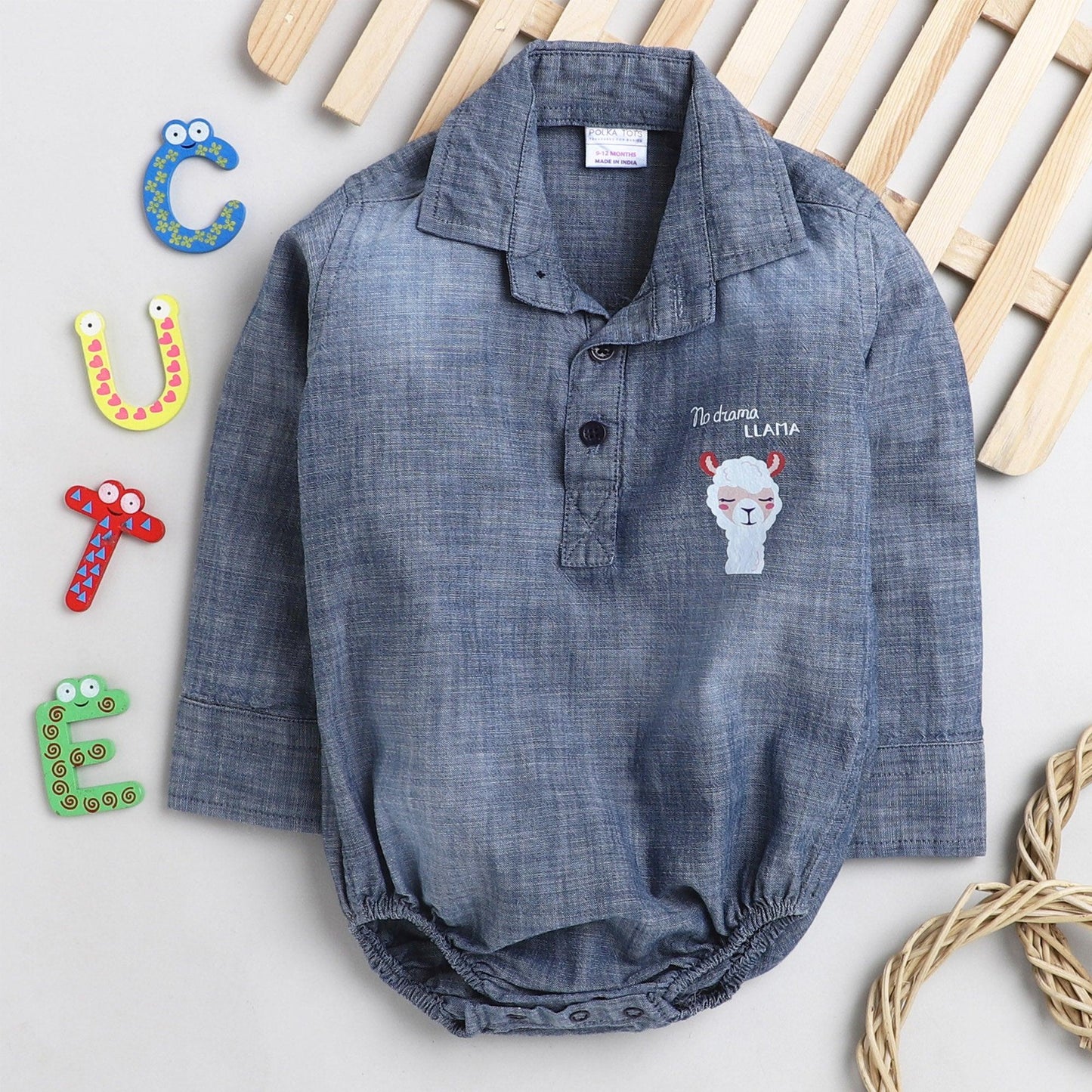 Polka Tots Full Sleeve Denim Onesie with llama print - Blue
