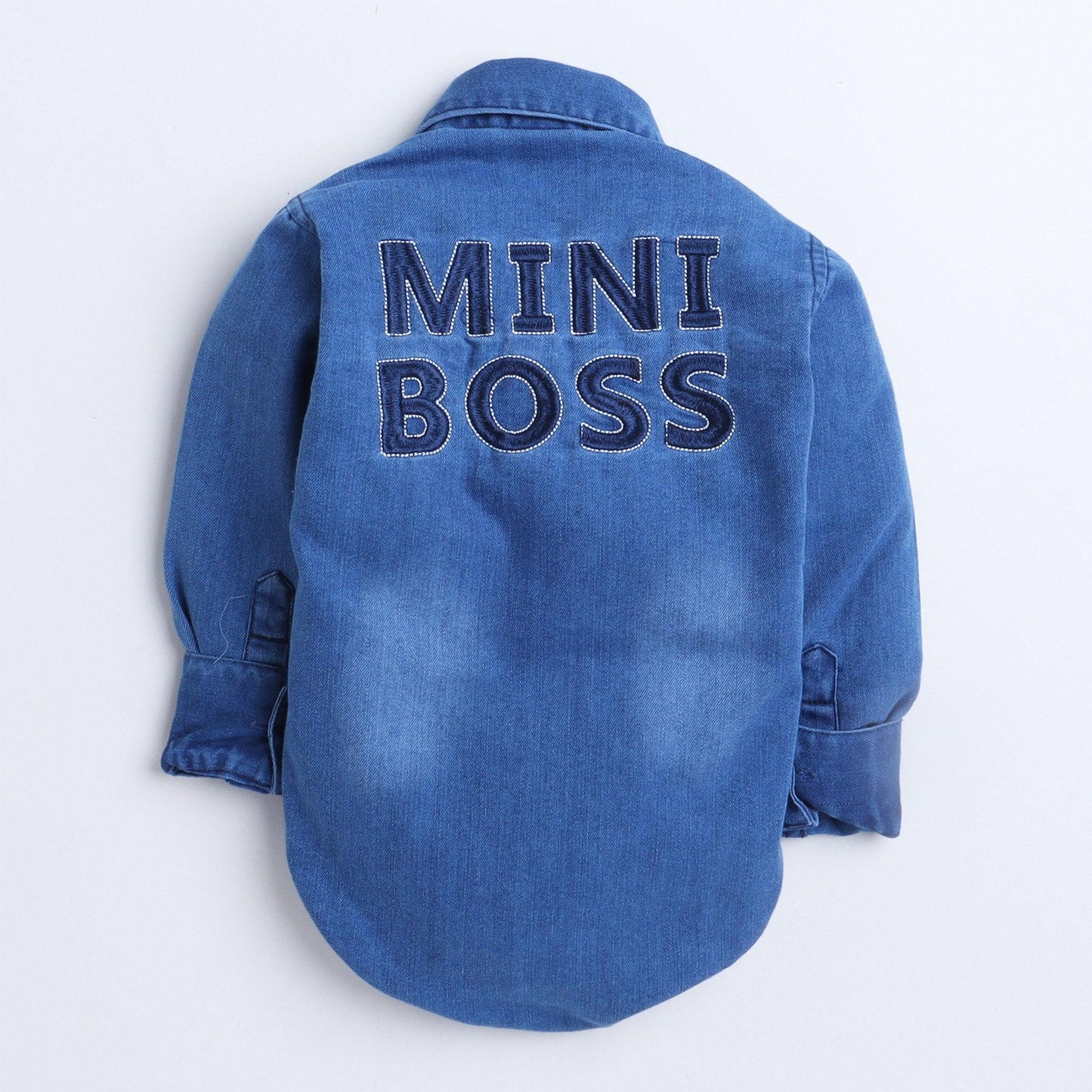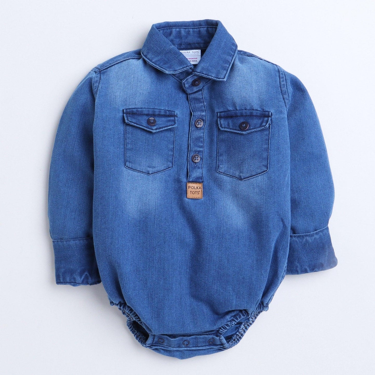 Polka Tots Full Sleeve Denim Onesie with Two Pocket Flap and Lather Patch Mini Boss - Blue