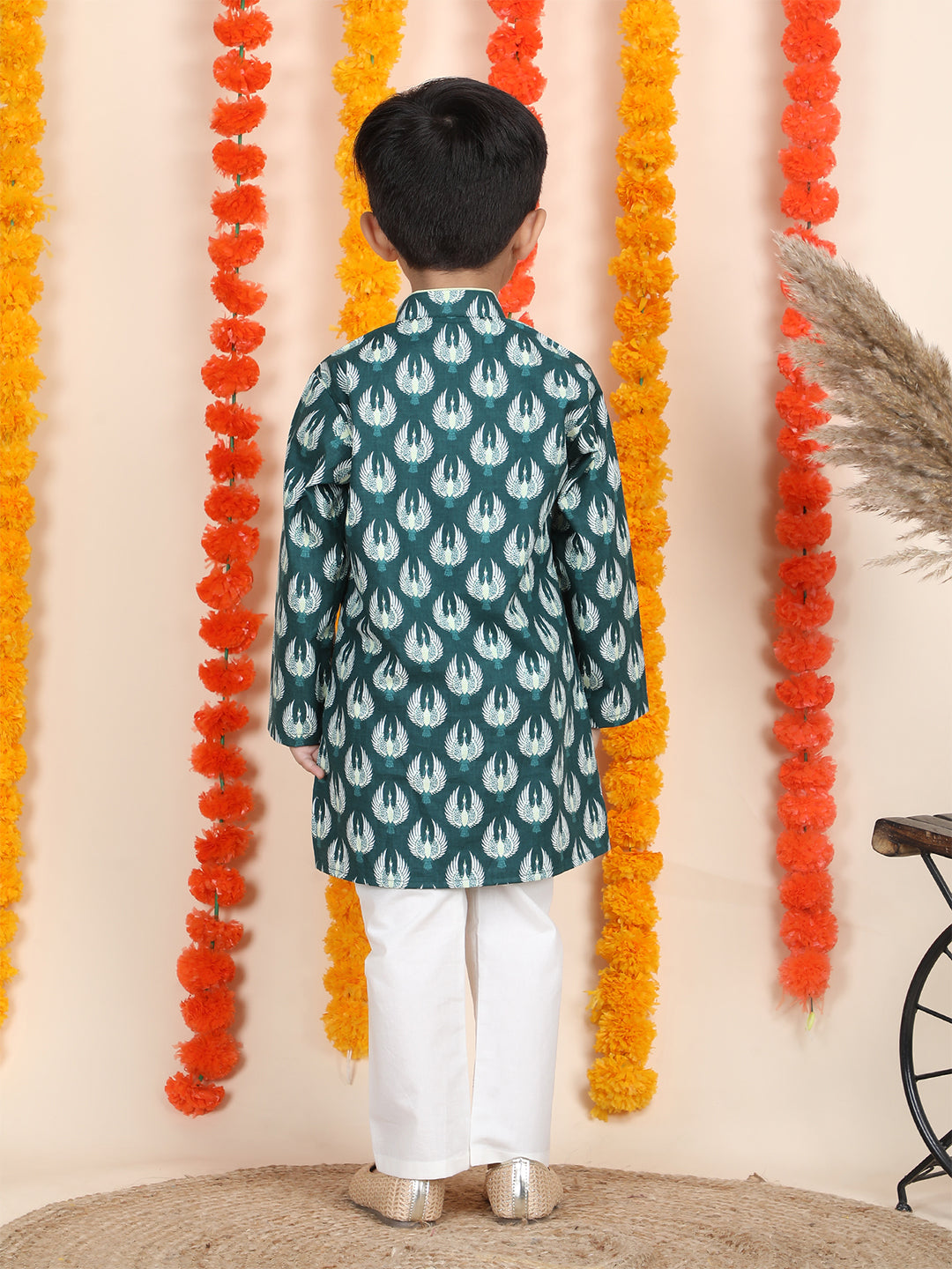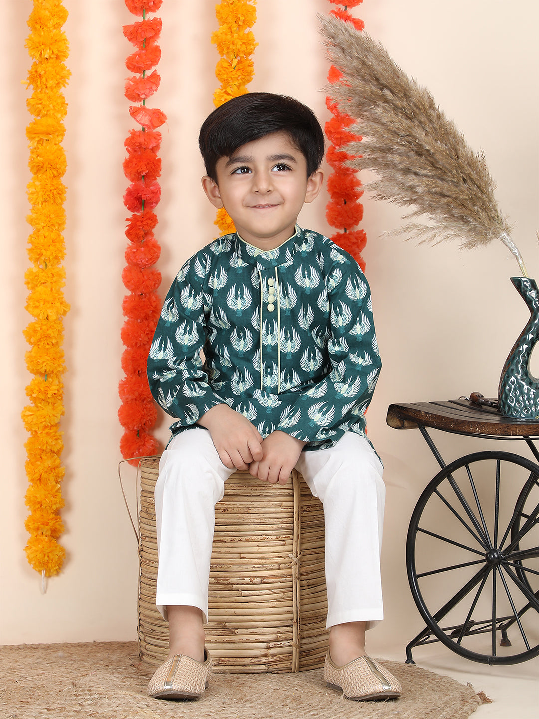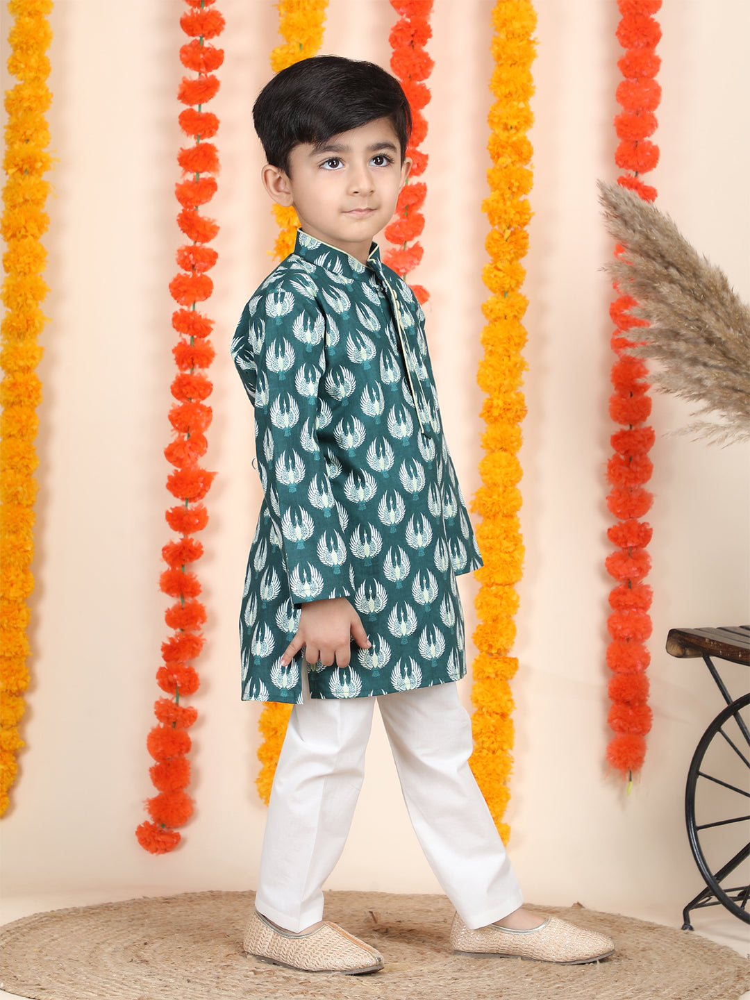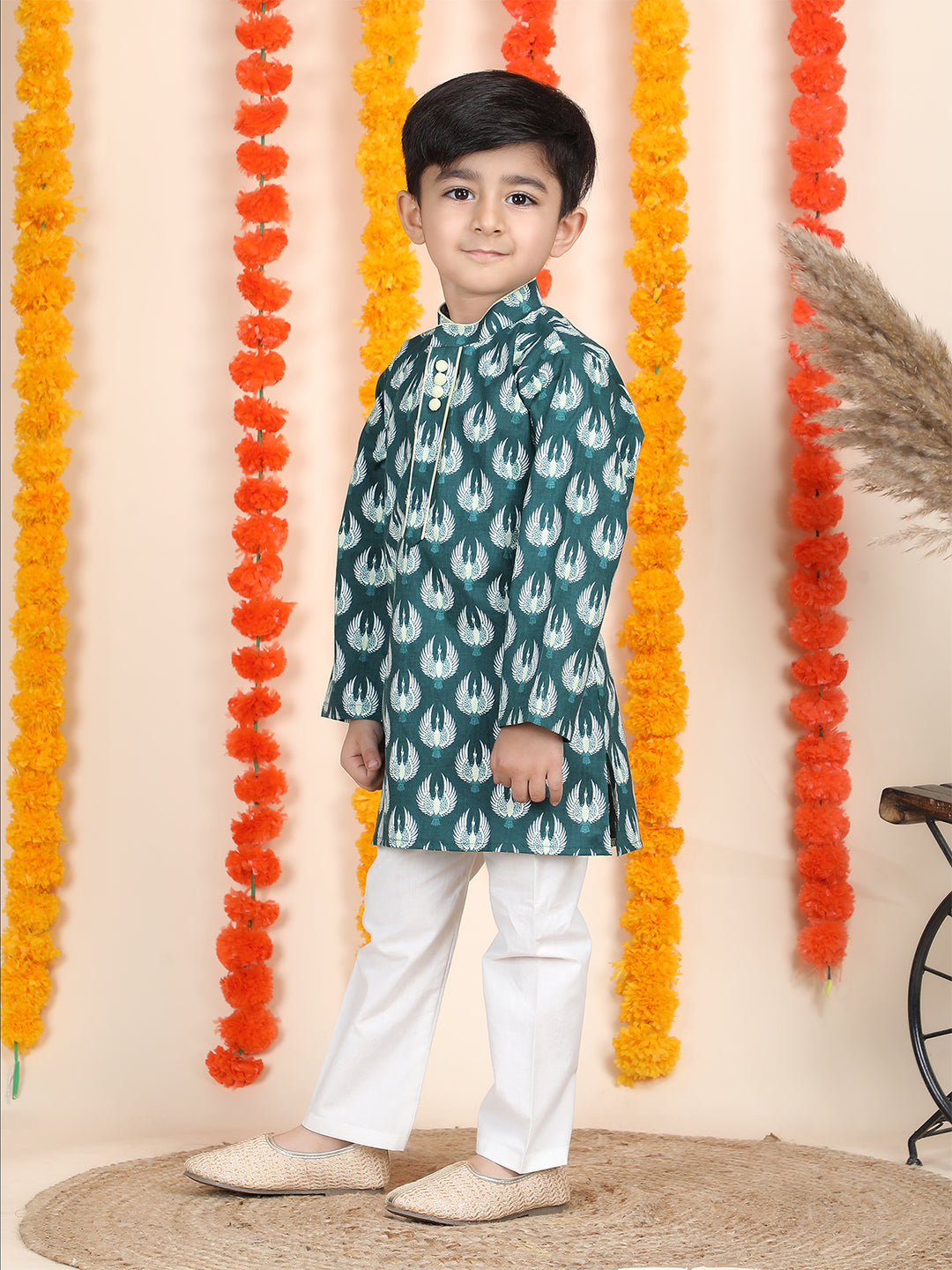 Polka Tots Full Sleeve Bird Print Ethnic Kurta Pyjama Set - Teal