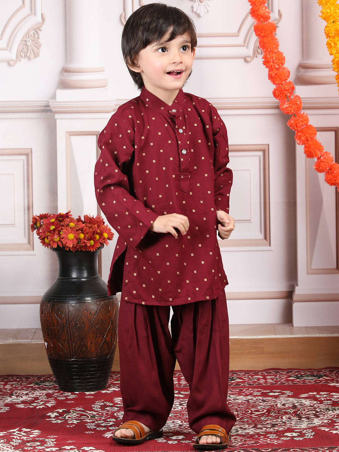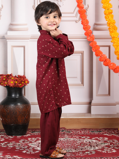 Polka Tots Full Sleeve Ethnic Motif Kurta Pyjama Set - Maroon