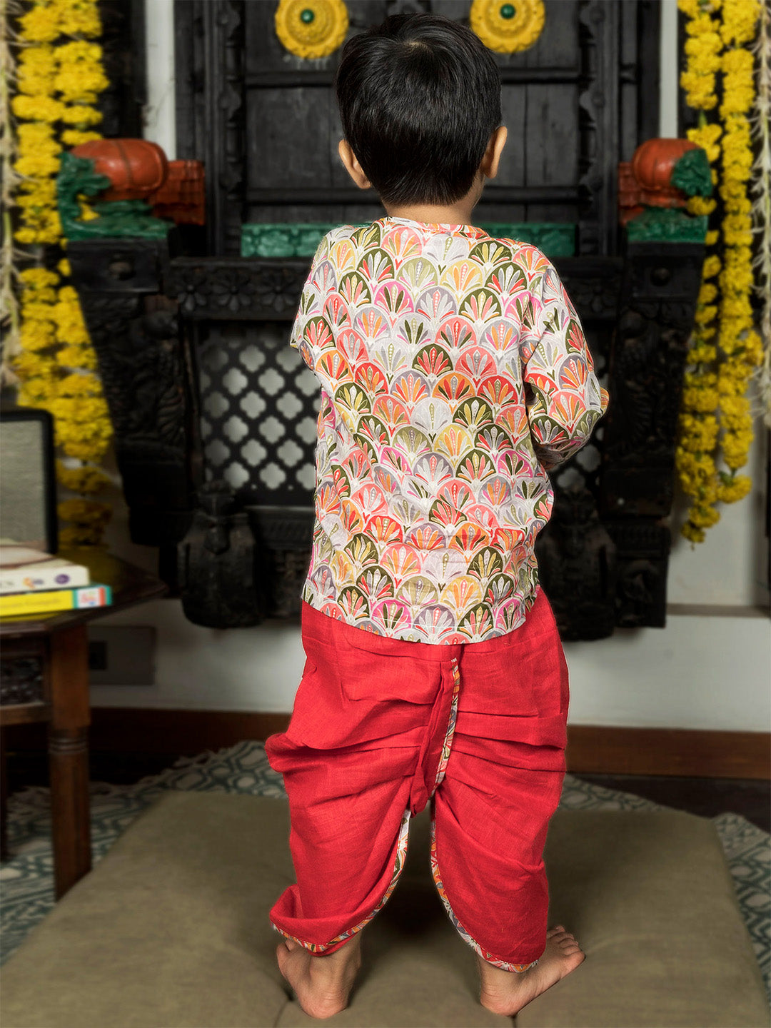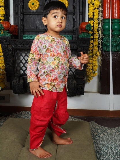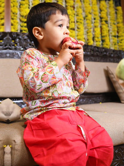 Polka Tots Full Sleeves Floral Print Angrakha with Dhoti - Red