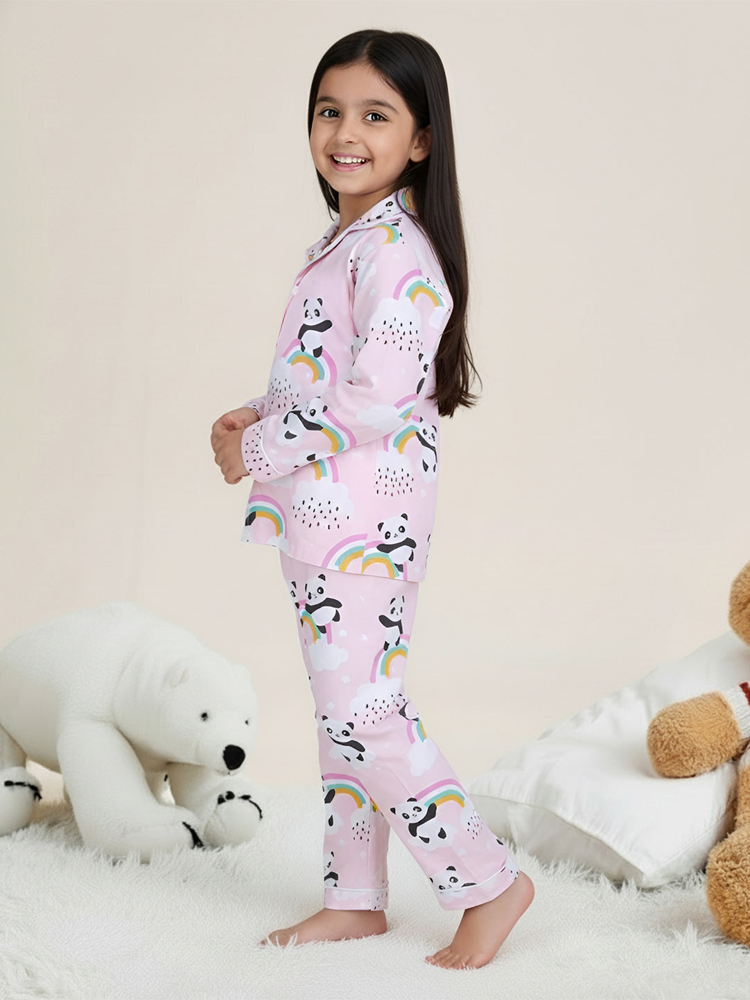 Polka Tots Full sleeve Panda Rainbow Print Night suit - Pink – PolkaTots.in Skip to content