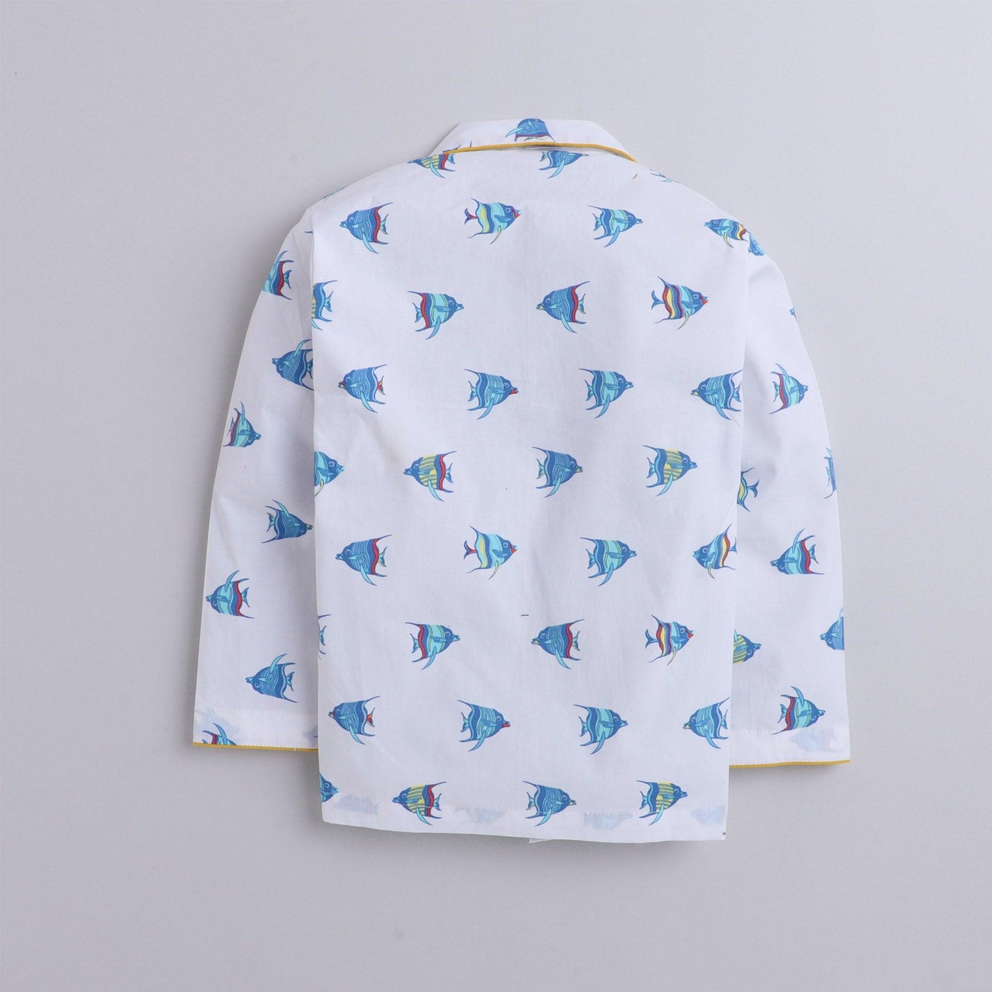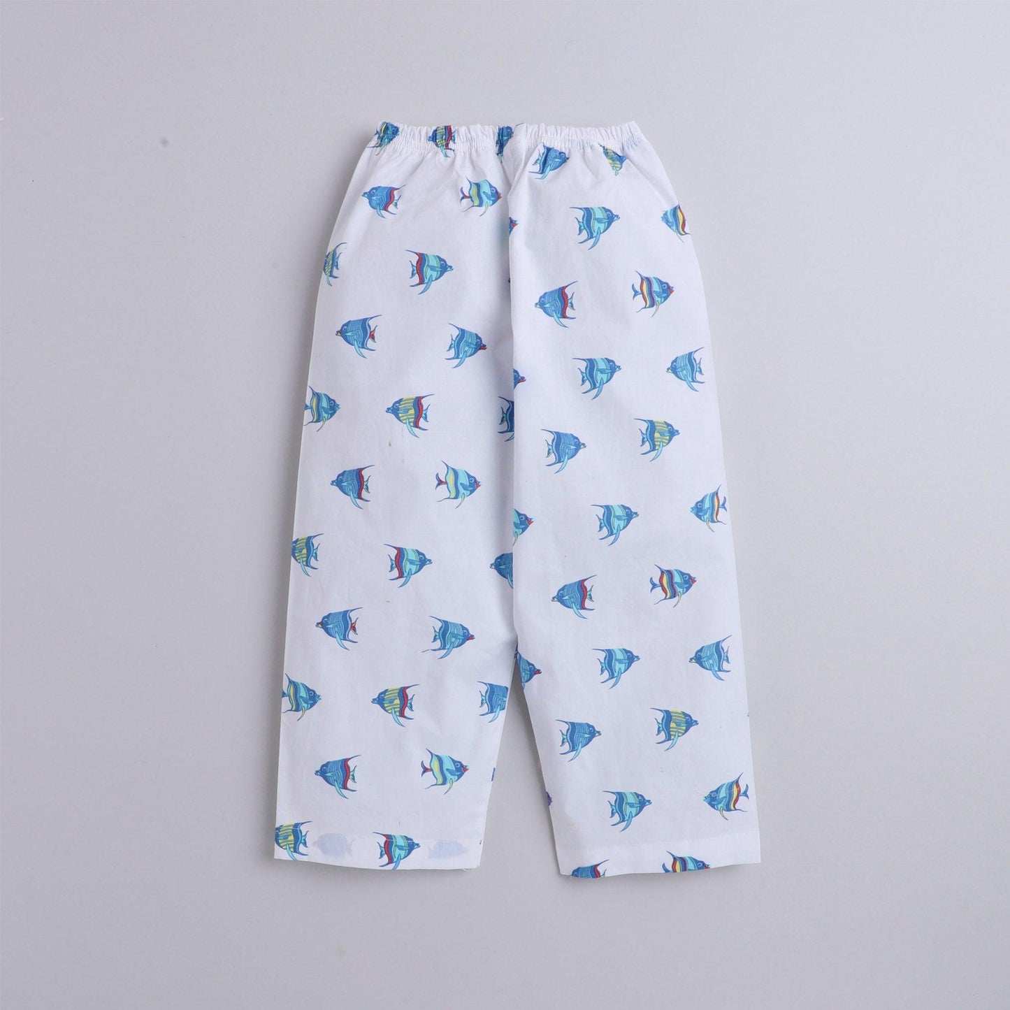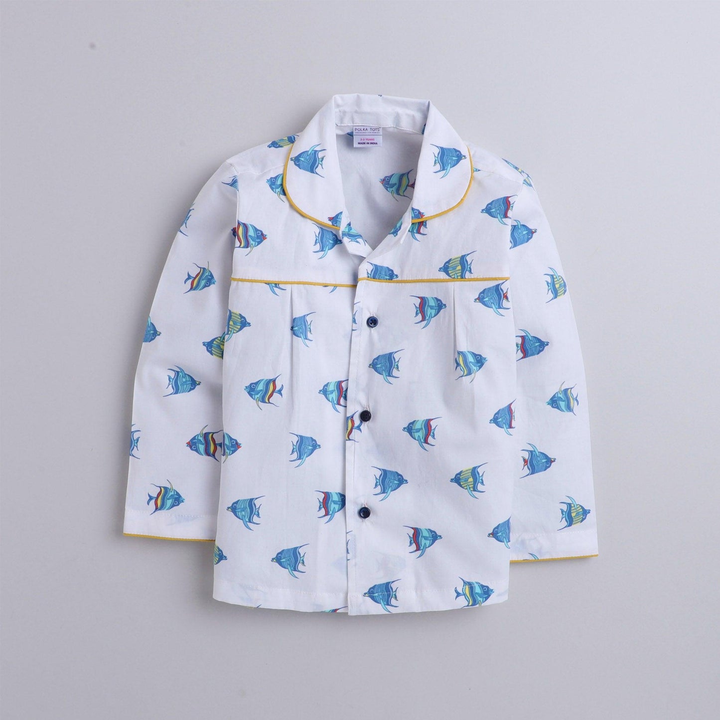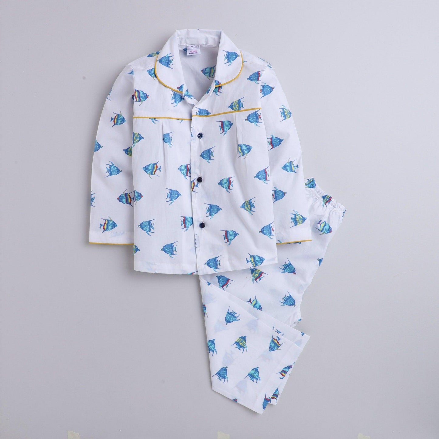 Polka tots Full Sleeve Night Suit Pair White (Fish)