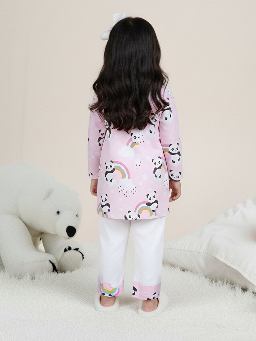 Polka Tots Panda Rainbow Print Full sleeves Nightwear Kurta pyjama set - Pink