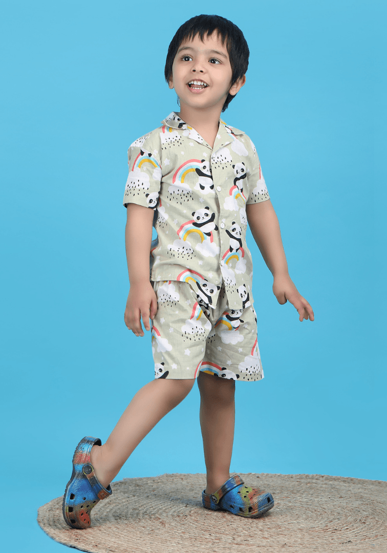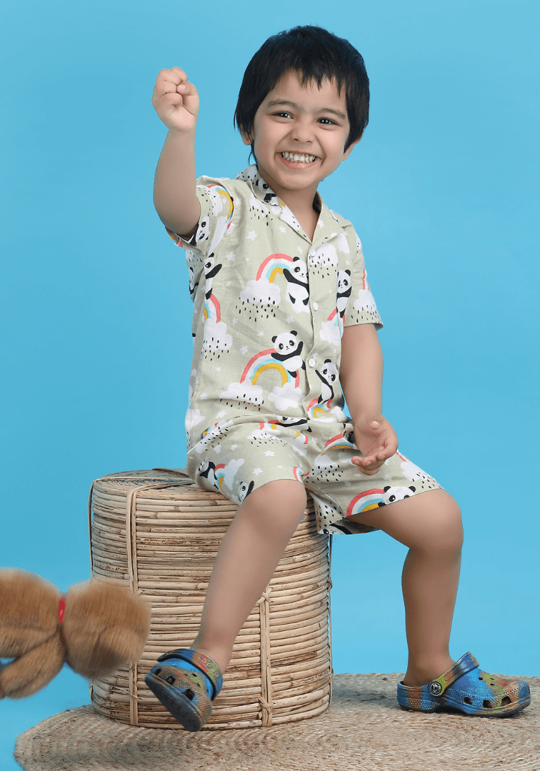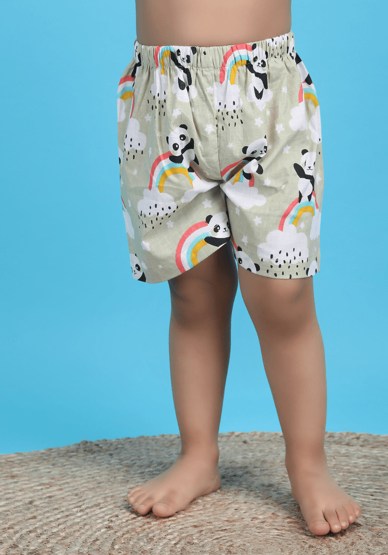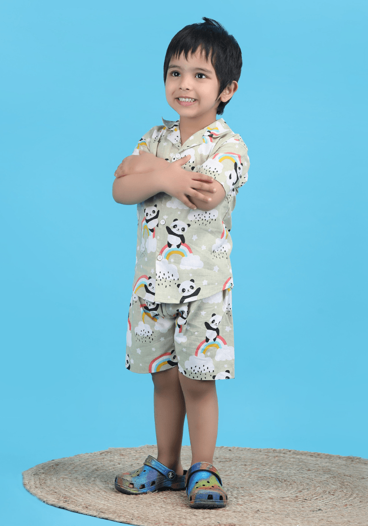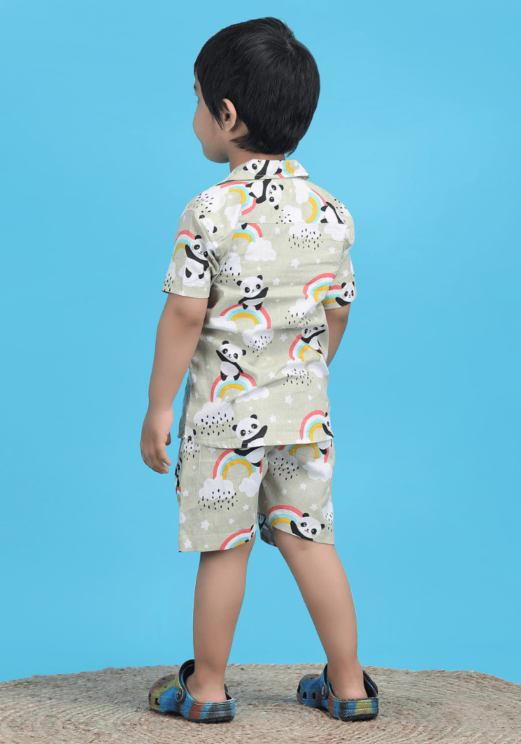 Polka Tots Half Sleeves Panda Rainbow Print Co-ord Shorts - Green