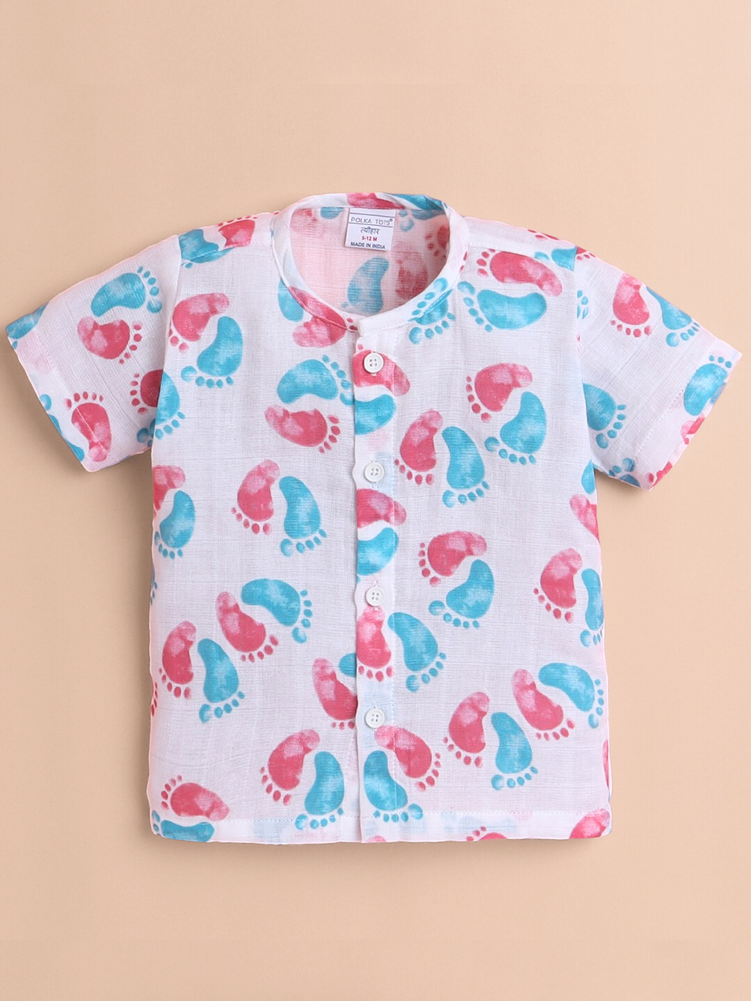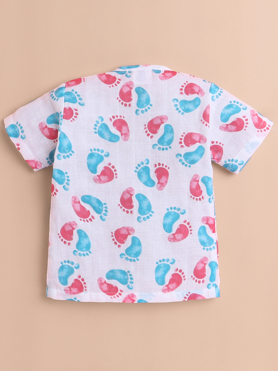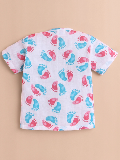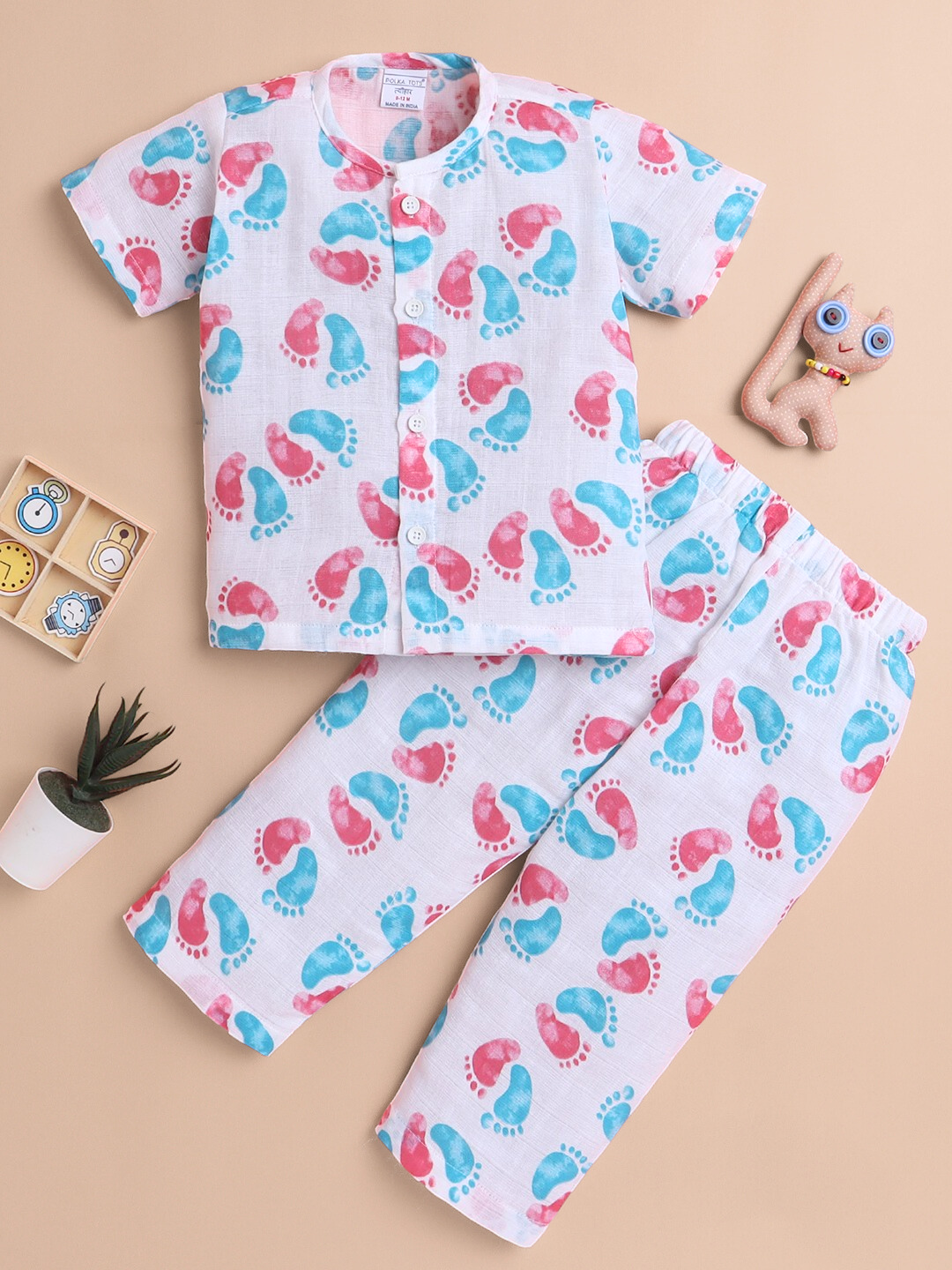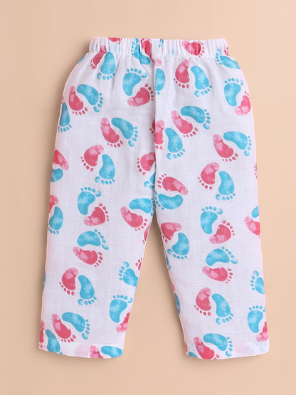Polka Tots Soft Muslin Cotton Half sleeves Lil Feet print Jhabla and Pant Set - Pink & Blue