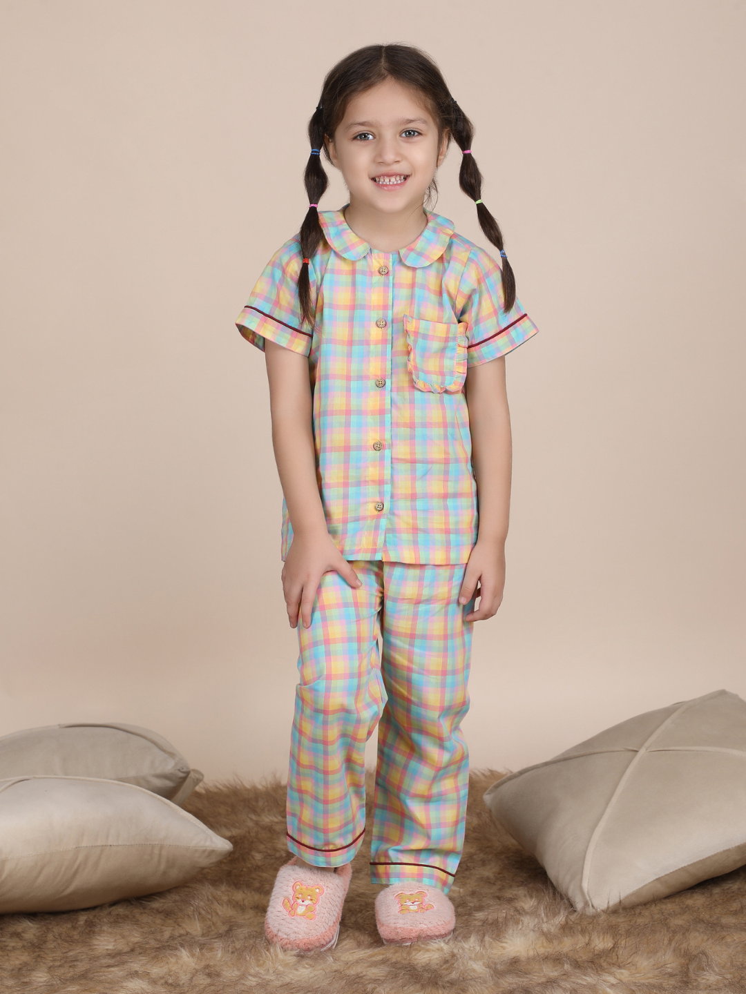 Polka Tots Half sleeves Checks print Night Suit - Multicolor