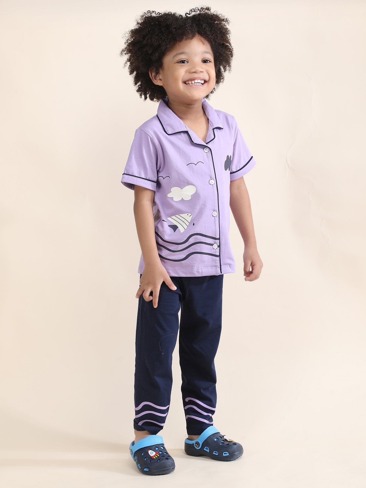 Polka Tots Half sleeves Fish print Night Suit - Purple