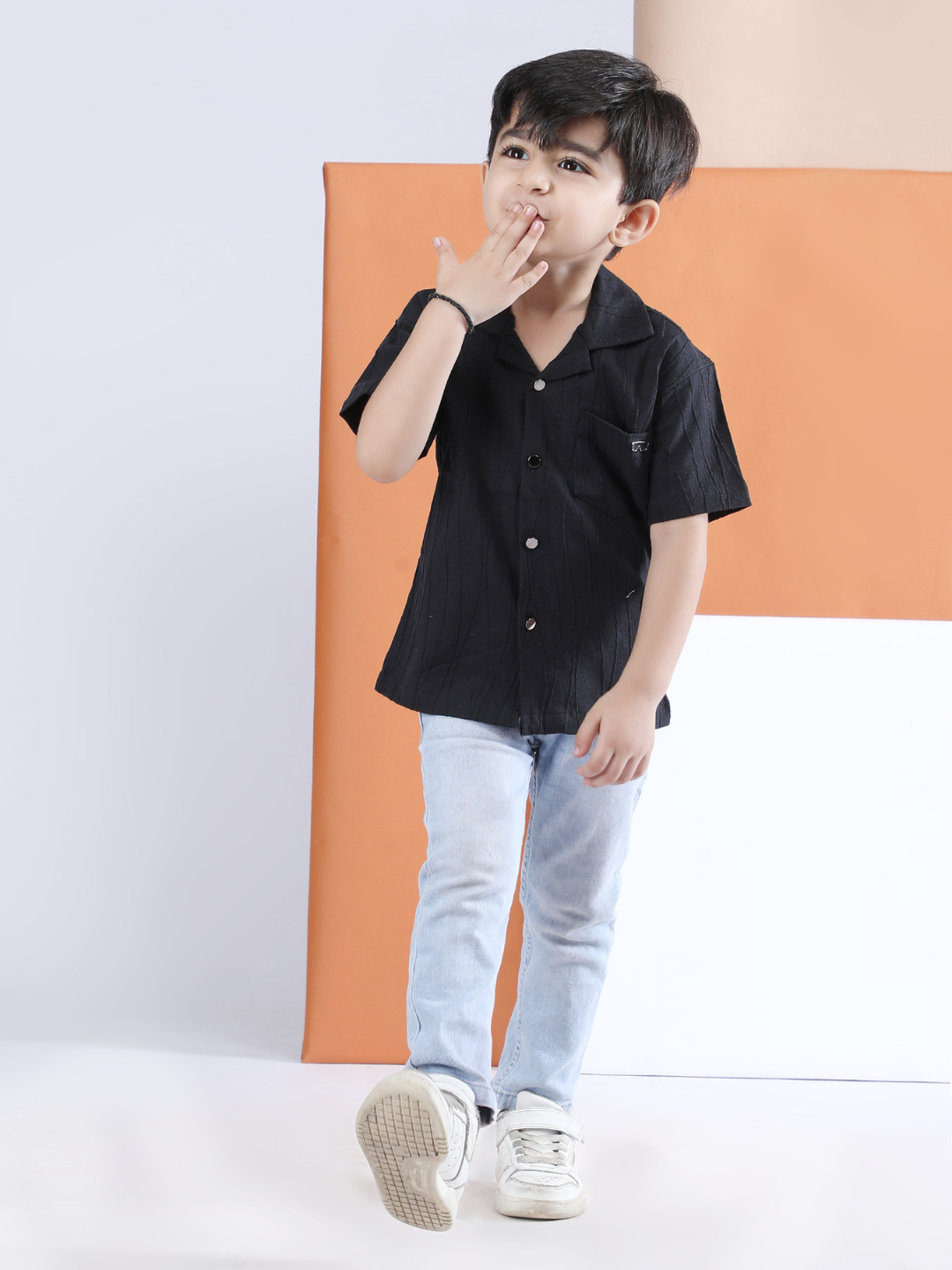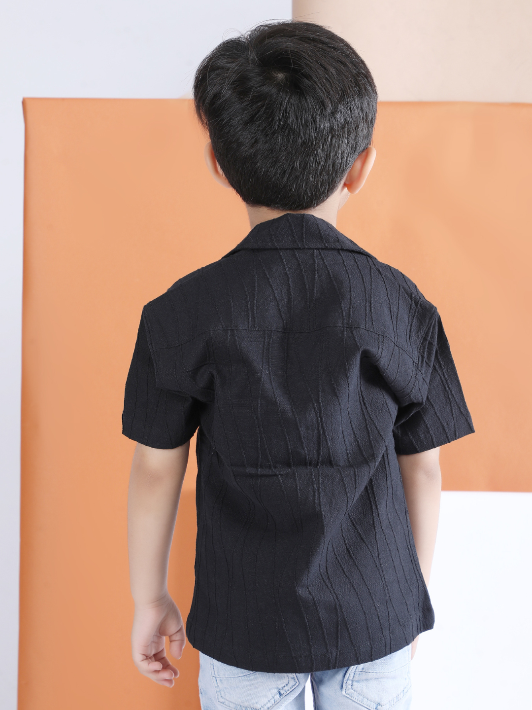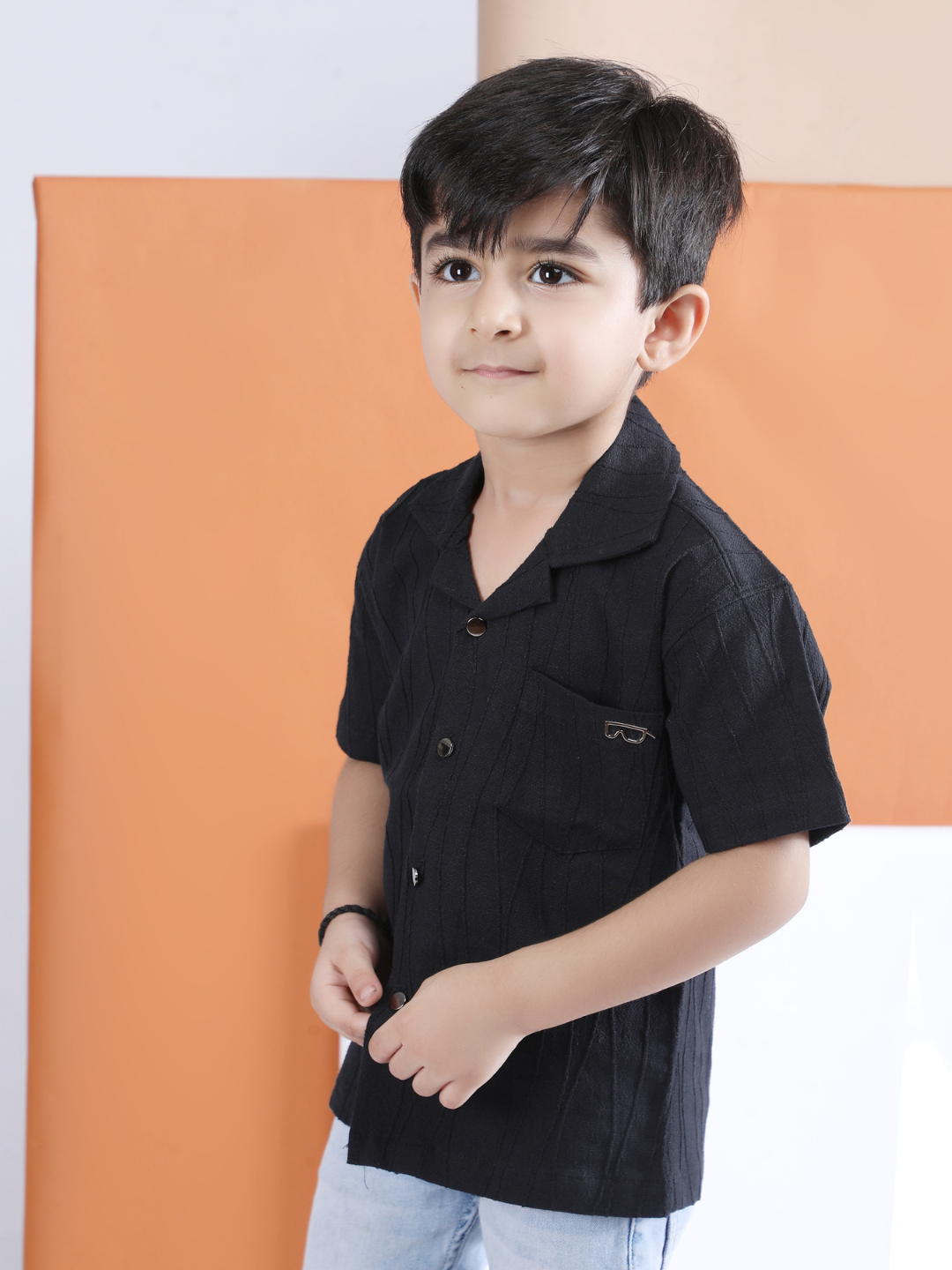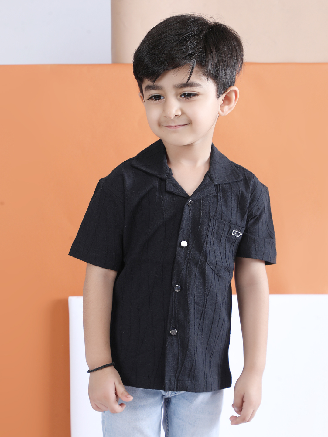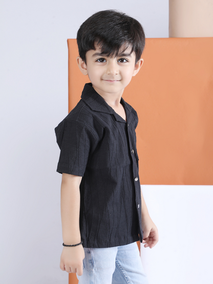 Polka Tots Half sleeve Sunglass Embroidery Textured Shirt - Black