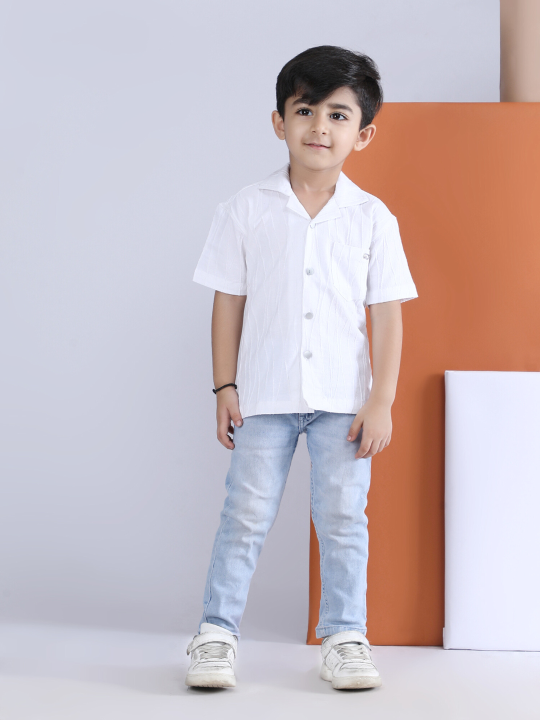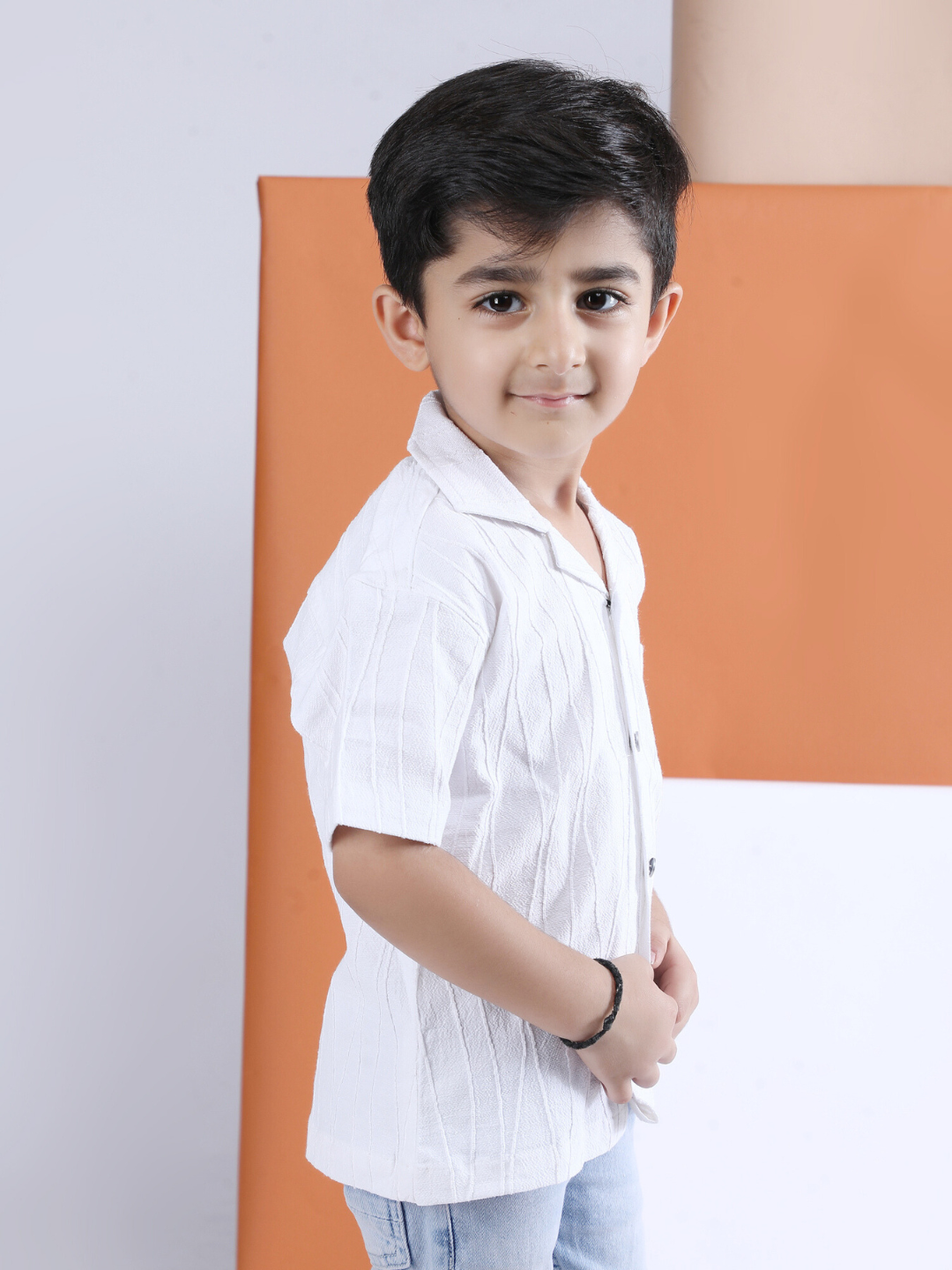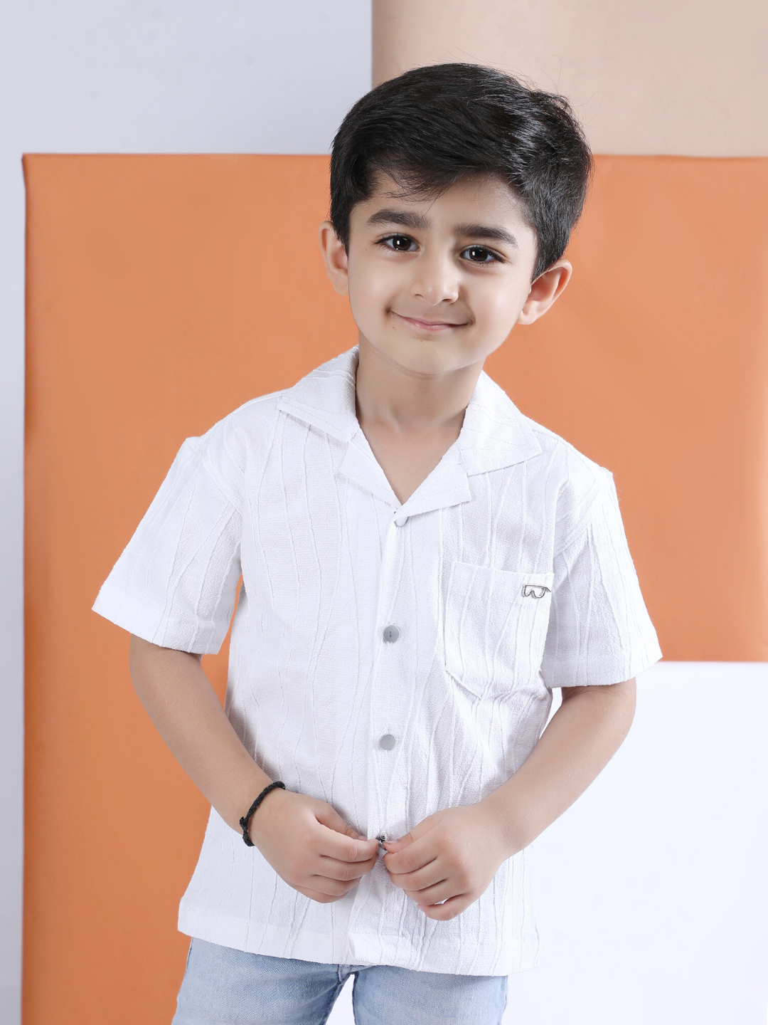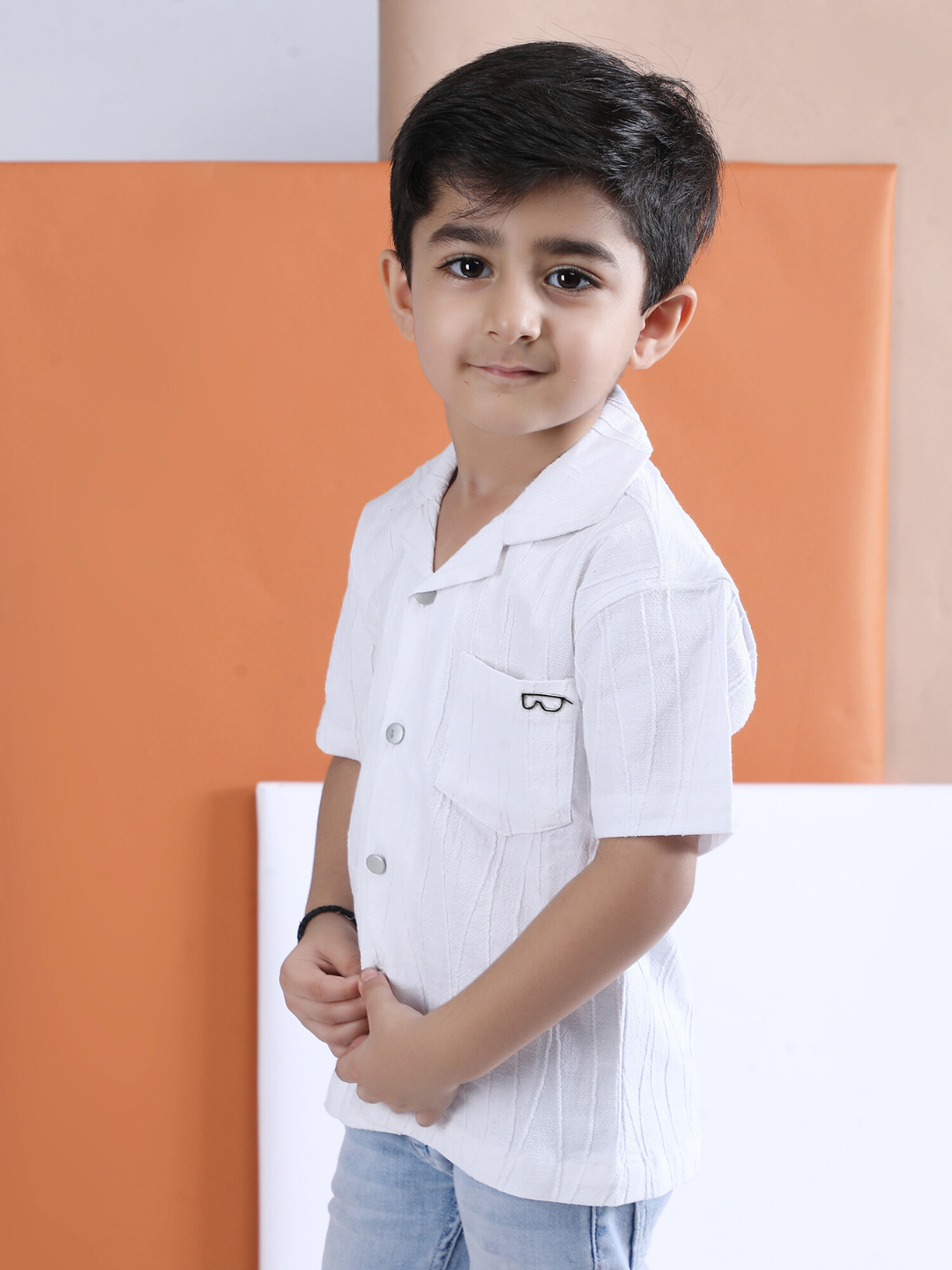 Polka Tots Half sleeve Sunglass Embroidery Textured Shirt - White