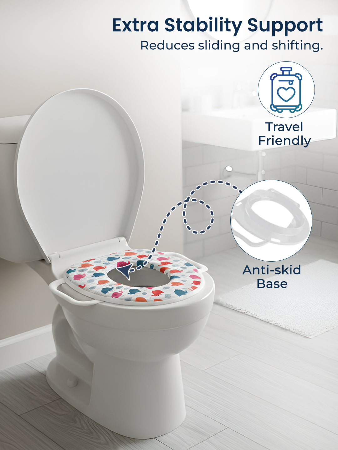 Soft cushion along with the side handles to keep your kid comfortable and maintain balance. Can be easily removed from the toilet seat and taken along conveniently while traveling. Also, it is very easy to clean. Put the trainer on the adult toilet seat, and check whether it is suitable.